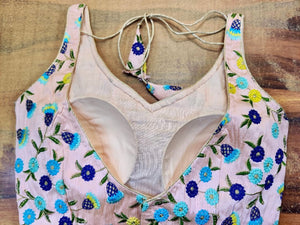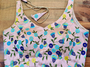 Stunning powder pink sleeveless saree blouse with blue floral embroidery. Buy online from Pure Elegance.