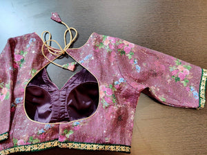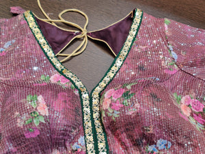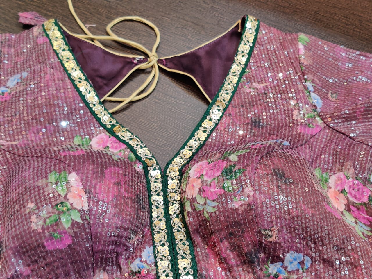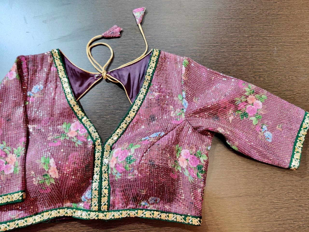 Beautiful purple embroidered floral designer saree blouse with green embroidered lace. Buy online from Pure Elegance