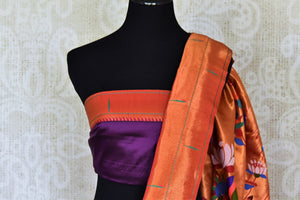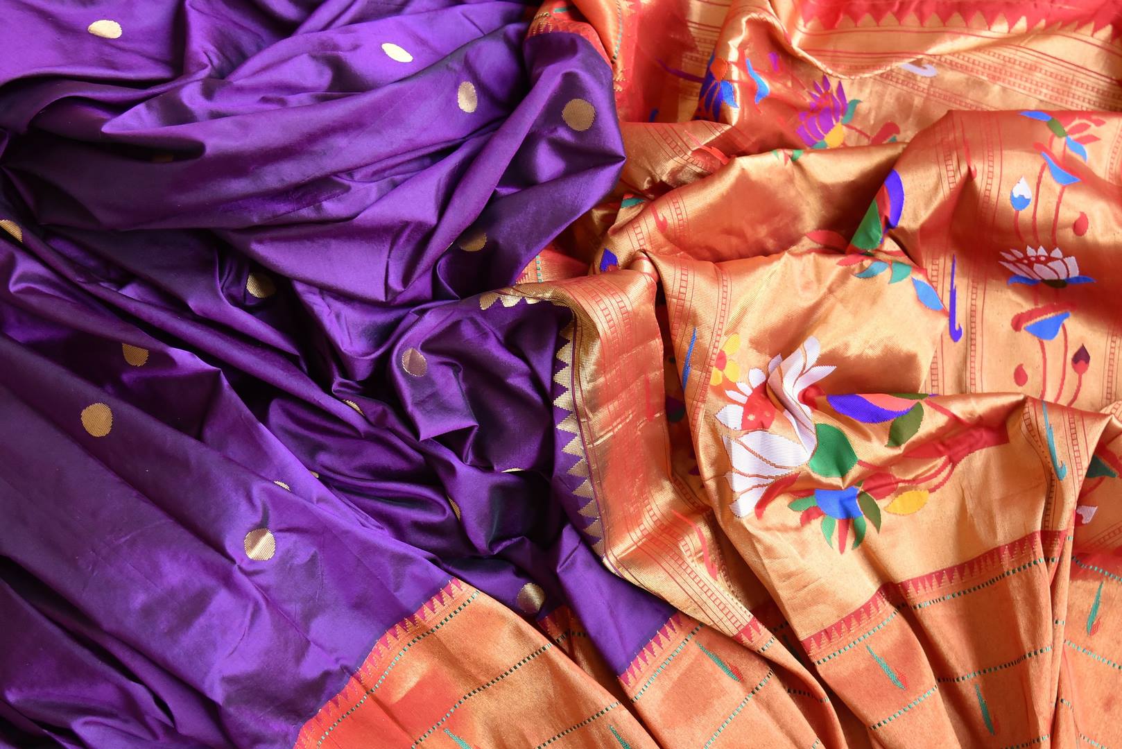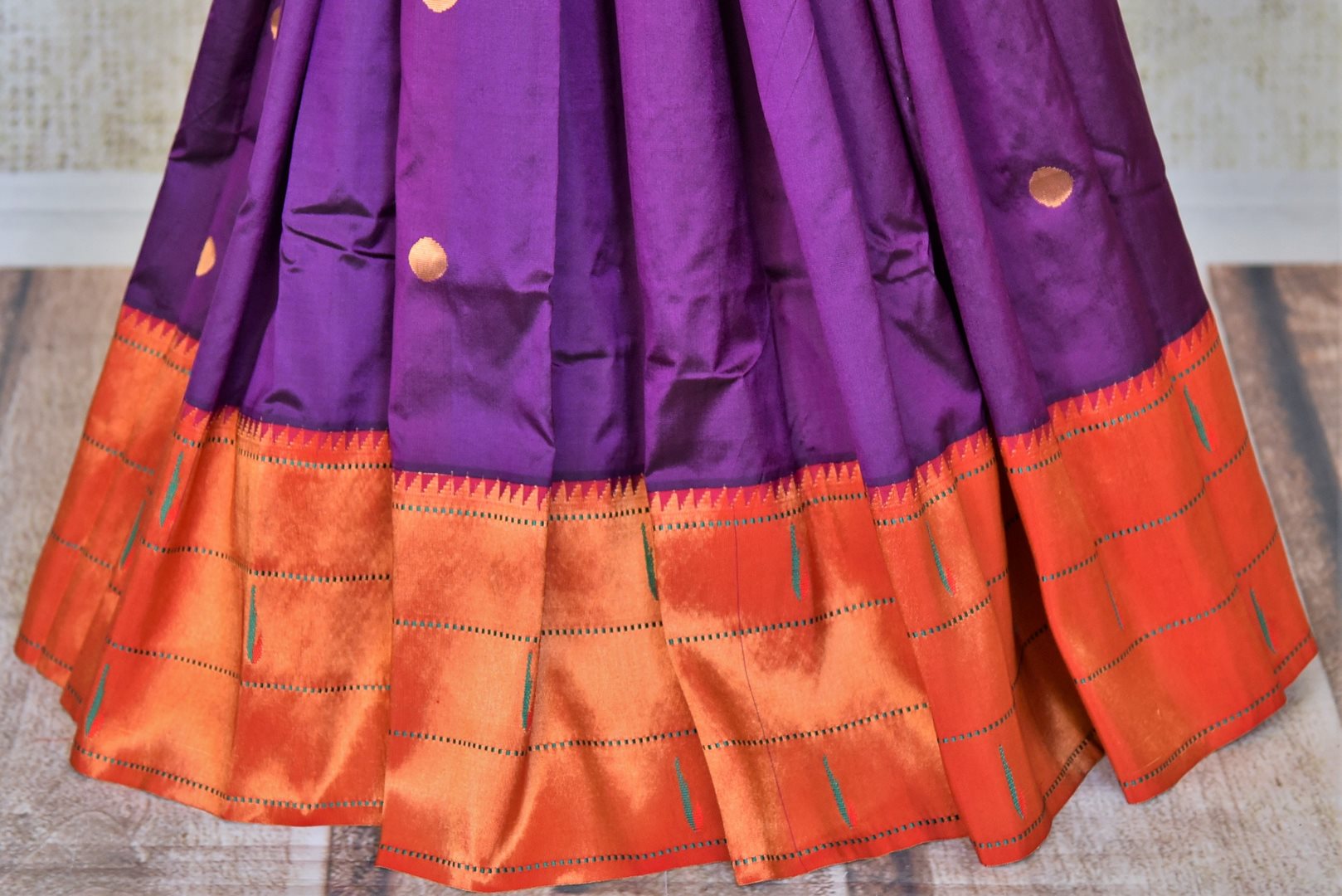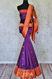Go for a rich traditional look on festive occasions in this royal purple color handloom silk Paithani sari with red zari border and pallu. It comes with a matching blouse piece. Shop designer sarees in USA from Pure Elegance.