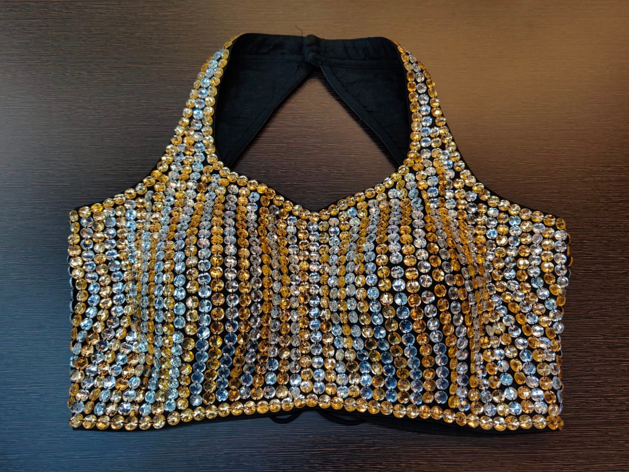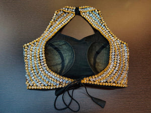 Gorgeous silver and golden stone work halter neck saree blouse. Shop designer saree blouse online in USA from Pure Elegance.