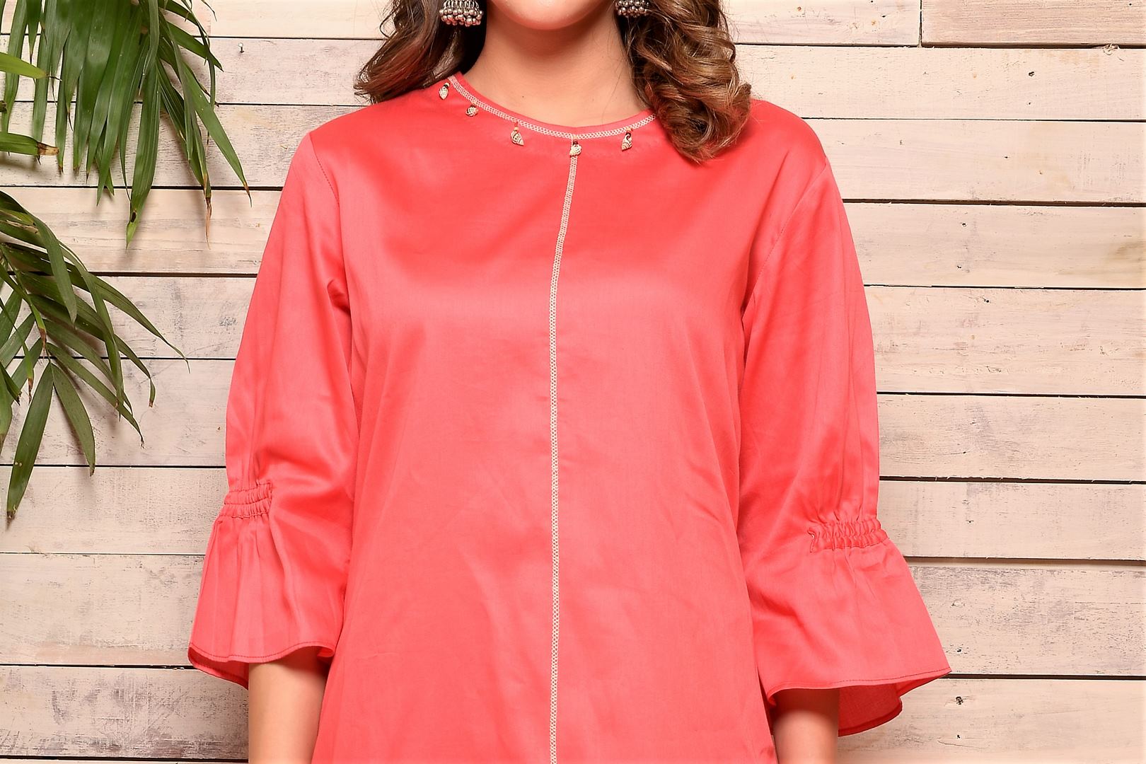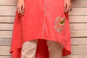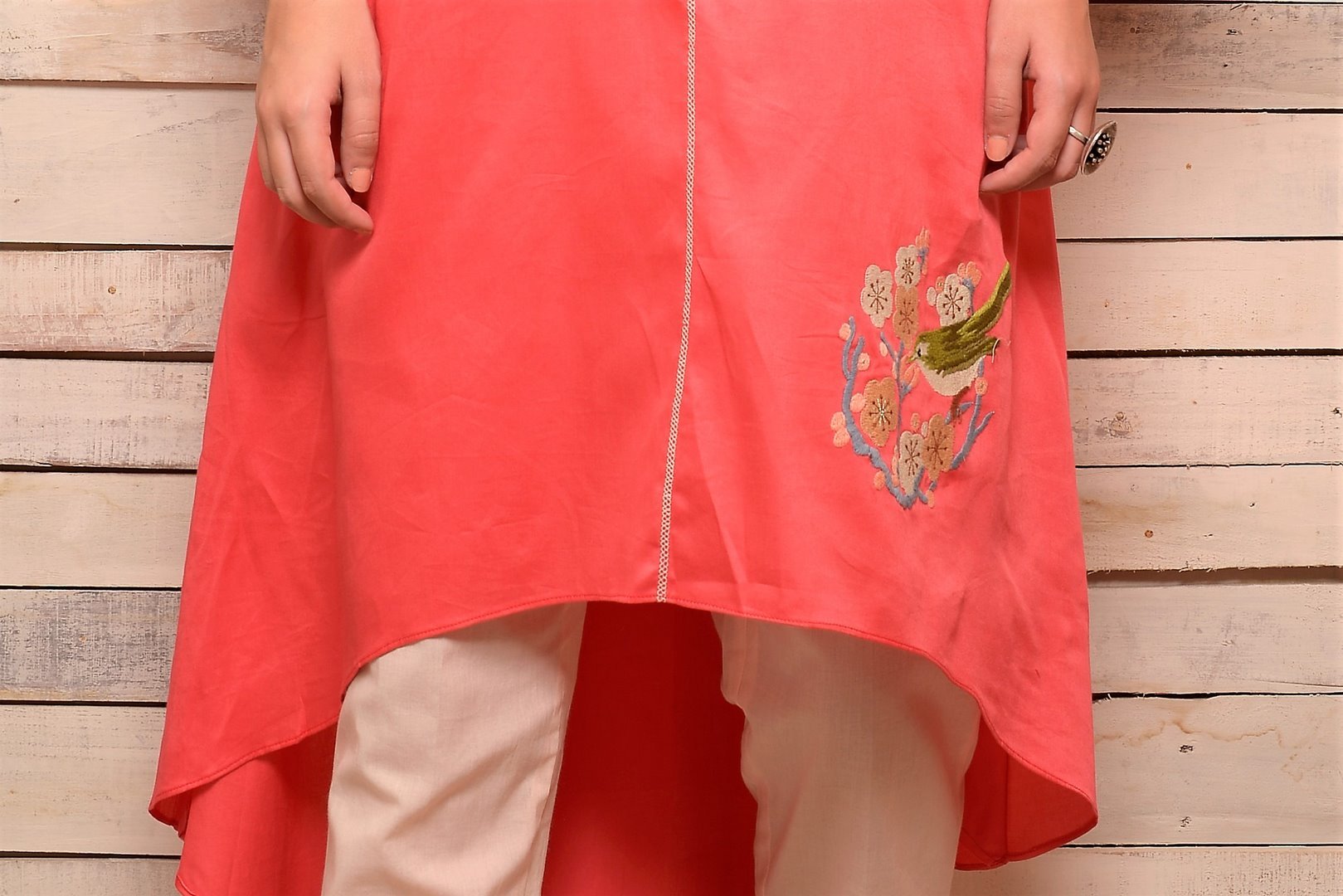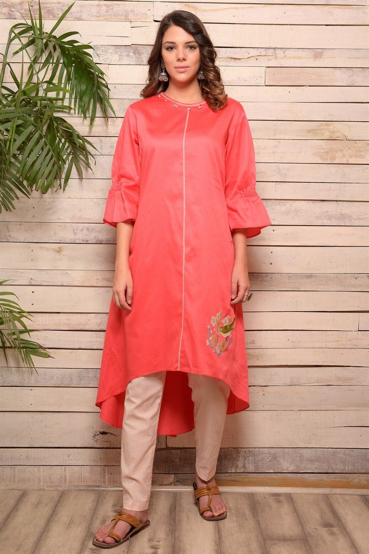 Keep it bright and easy breezy on a summer day with this tomato red embroidered cotton asymmetric shirt with pants from AAS by Aarti Gupta. The shirt tunic has a high low design with resham embroidered bird motif. Shop online at Pure Elegance or visit our store in USA.