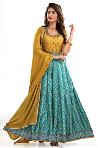 Gorgeous yellow and red dupion silk embroidered lehenga with chiffon dupatta. The suit is a perfect choice for weddings, engagement and sangeet. Buy online from Pure Elegance