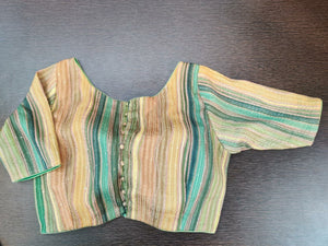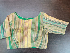 Stunning yellow and green stripes embellished sari blouse. Buy designer blouse in USA from Pure Elegance.