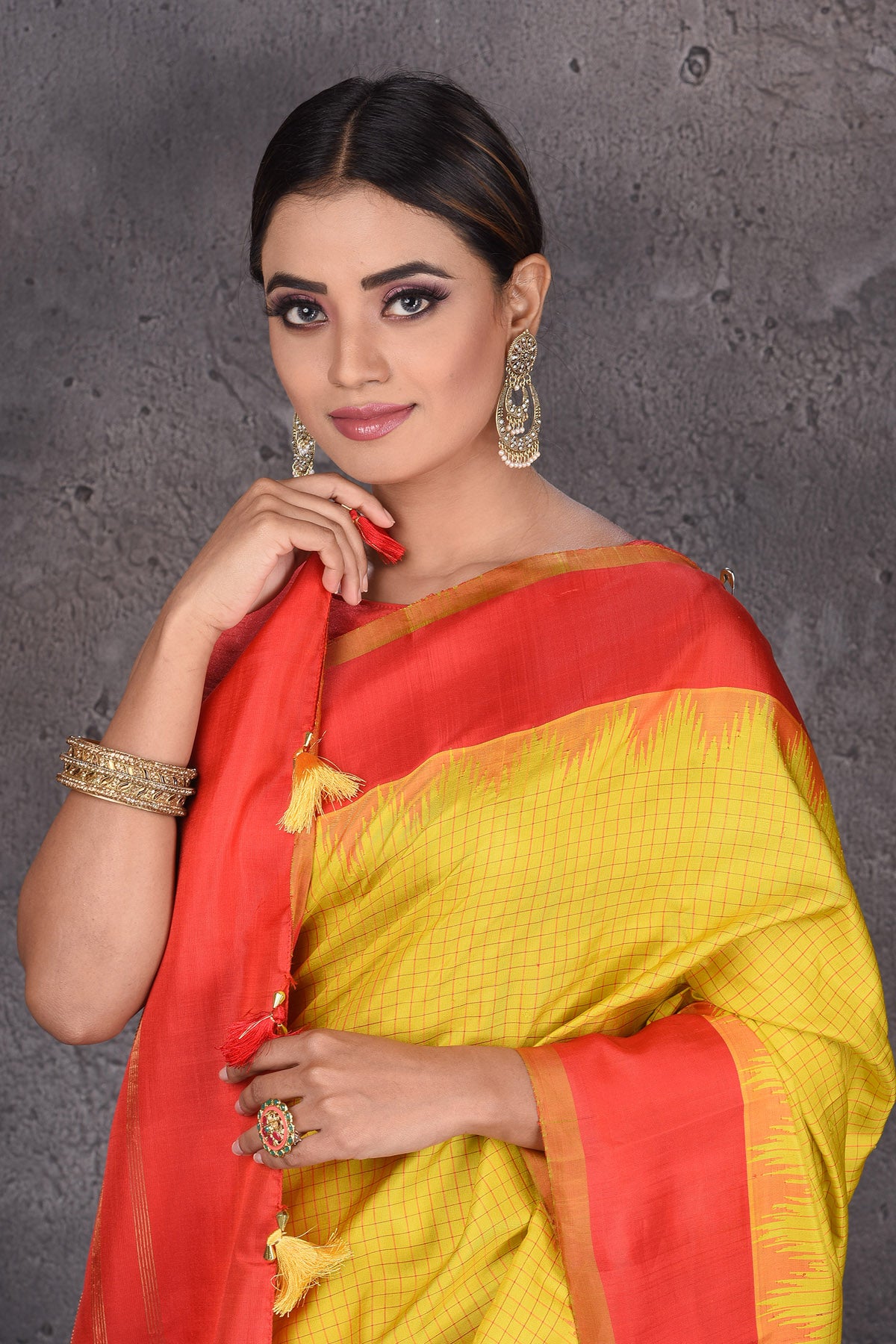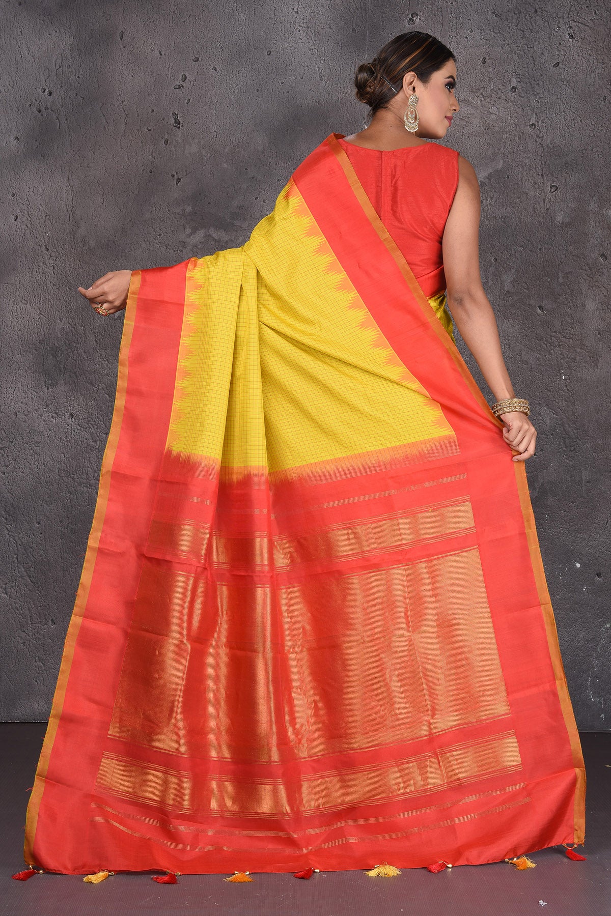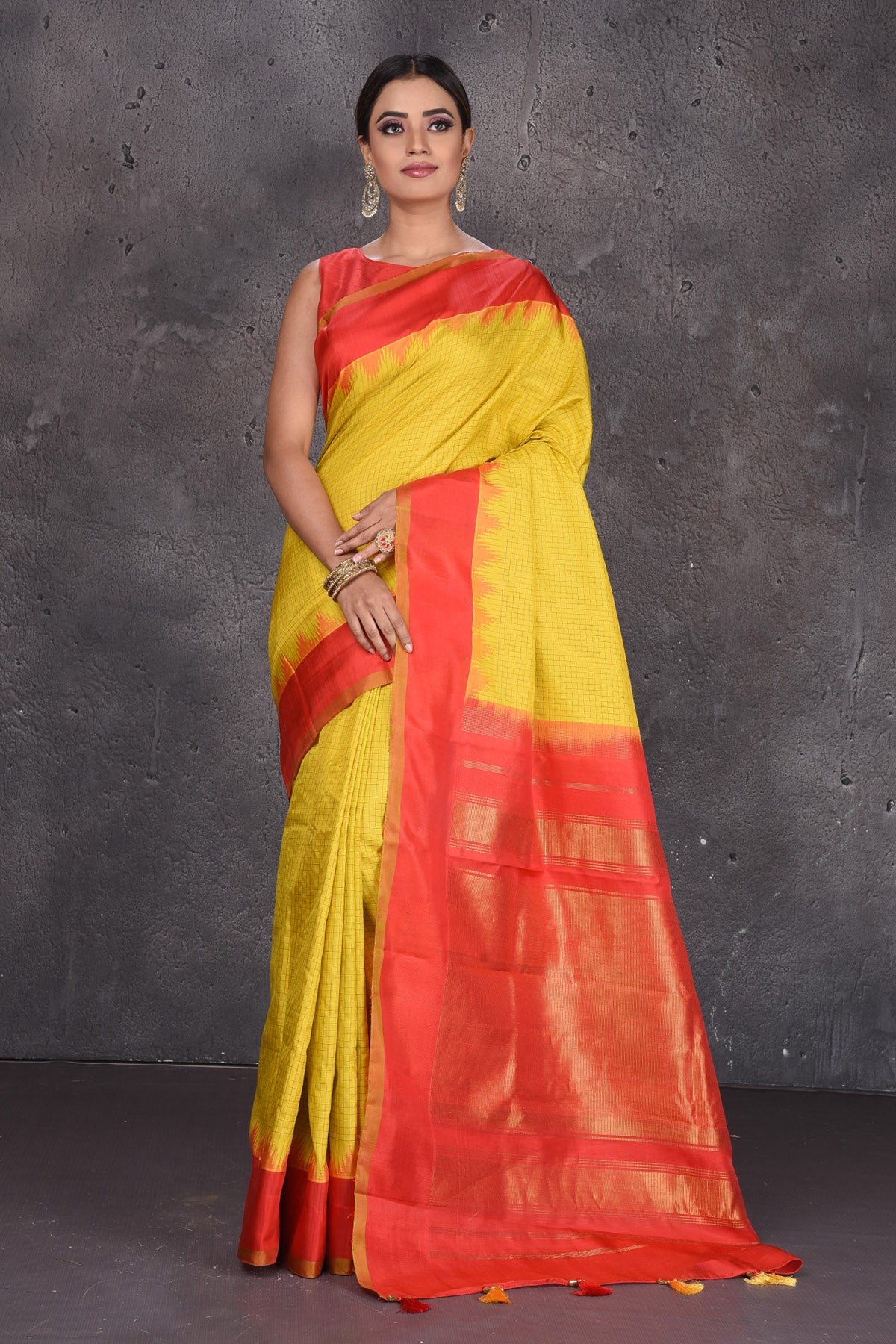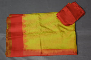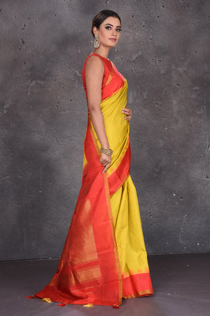 Look royal at weddings in this beautiful yellow Gadhwal handloom silk saree. The saree is enhanced with red golden zari border and pallu. It comes with a matching blouse piece. Shop silk sarees in USA from Pure Elegance.