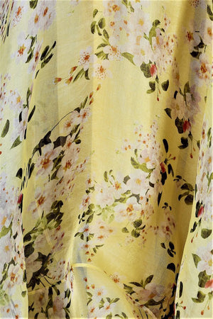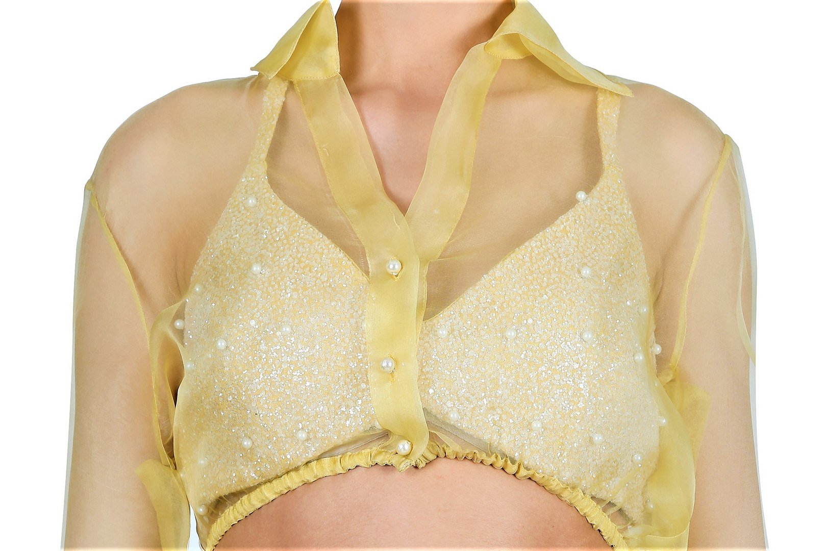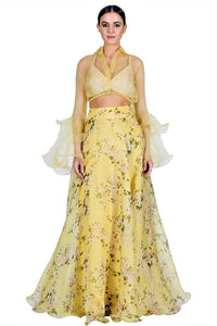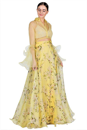 Bring some fun to your ethnic style with this yellow color sheer blouse with exaggerated sleeves and printed skirt! The shirt has an inner bralette with embroidery and a beautiful floral print skirt. It is crafted in organza and santoon. Shop online at Pure Elegance or visit our store in USA!