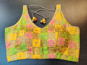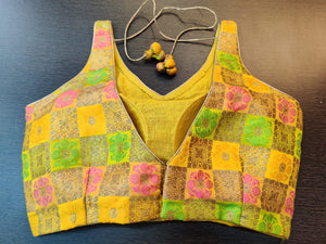 Gorgeous yellow sleeveless saree blouse with zari and minakari buta. Shop designer saree blouse online in USA from Pure Elegance.
