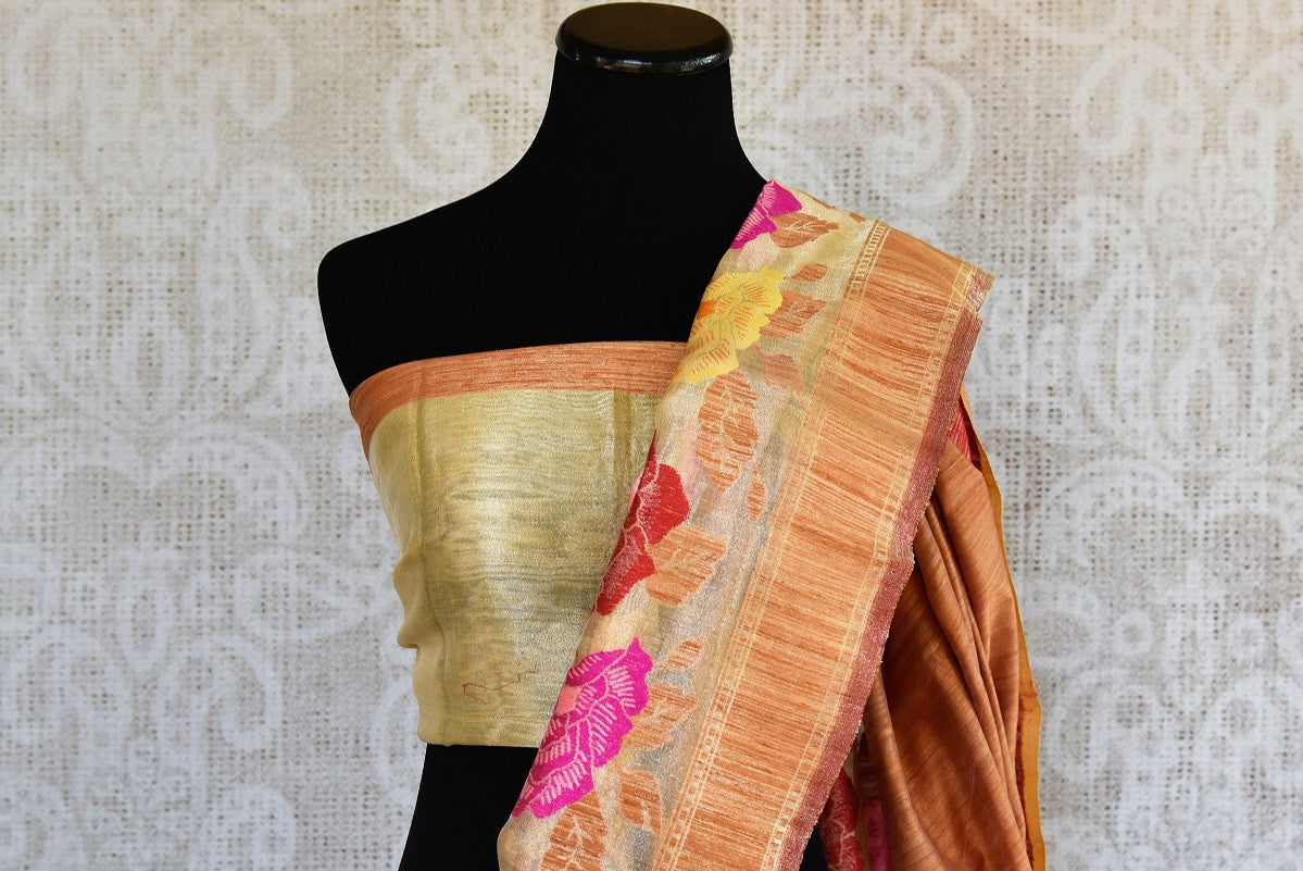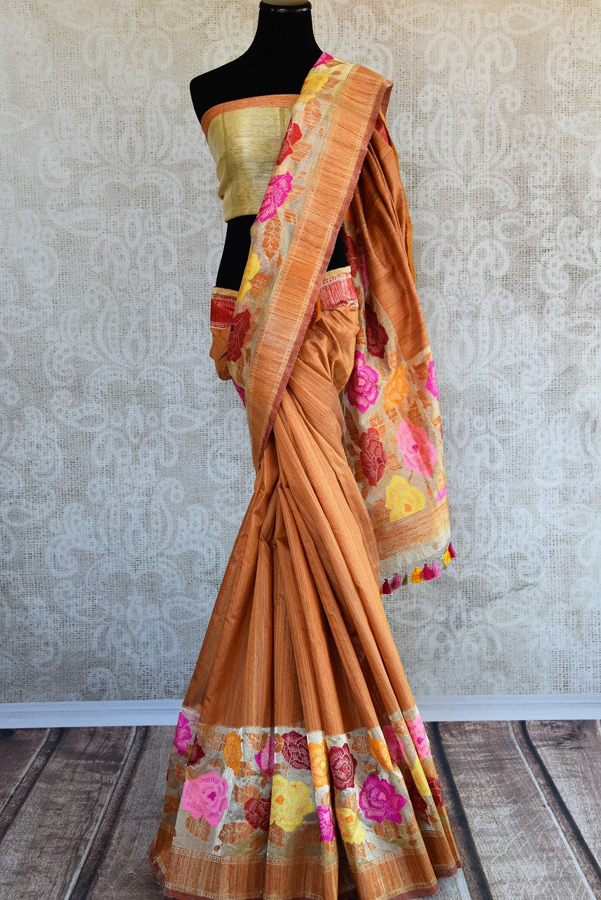 Tussar banarasi saree in orange yellow color with floral arrangement through the border and on pallu available in store Pure Elegance. Ideal pick for Parties.
