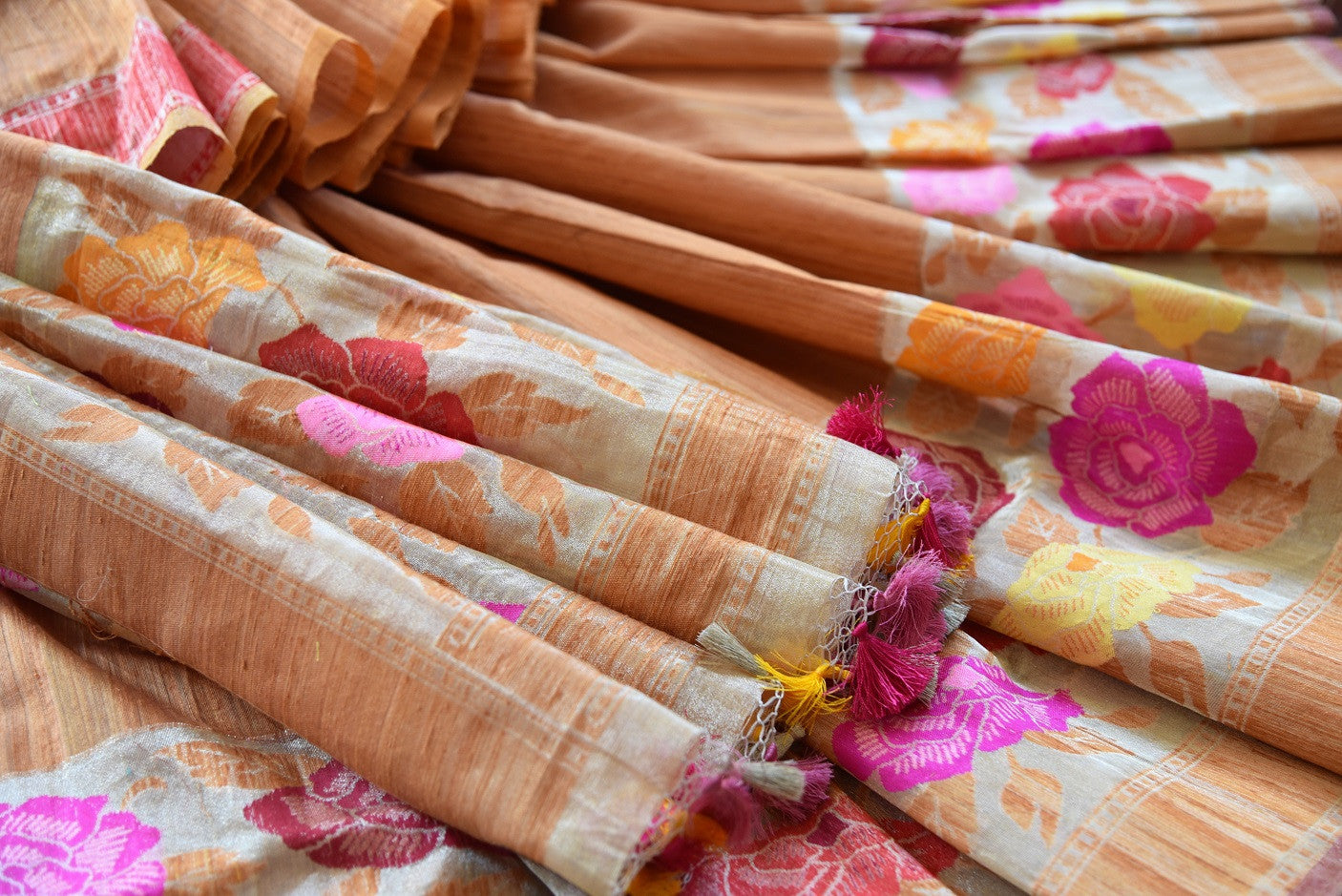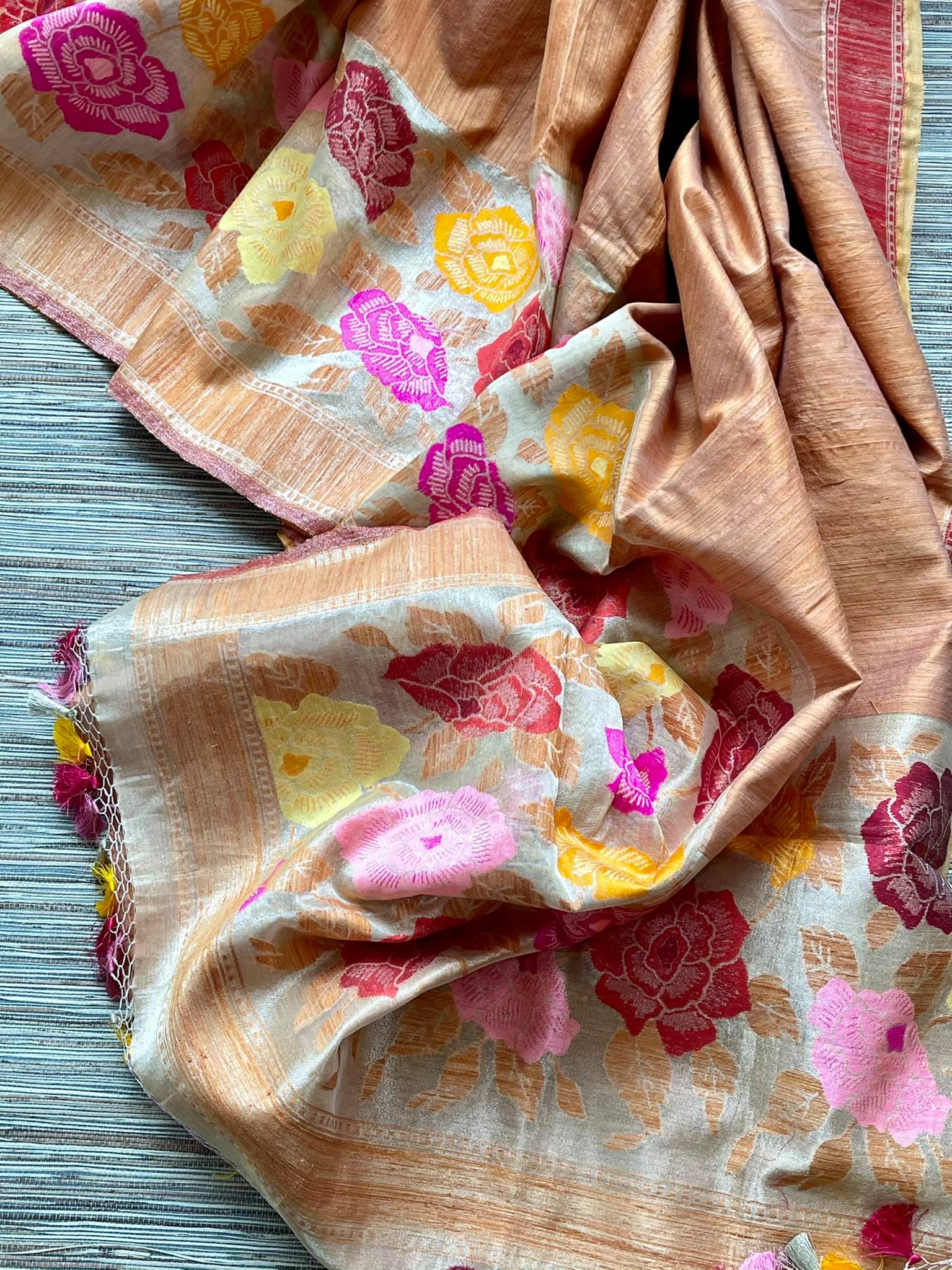 90D520 Orange Yellow Tussar Banarasi Saree With Floral Details