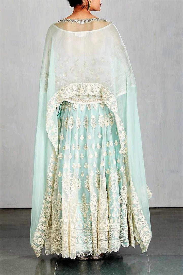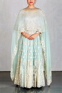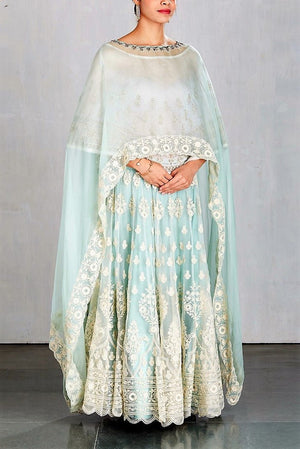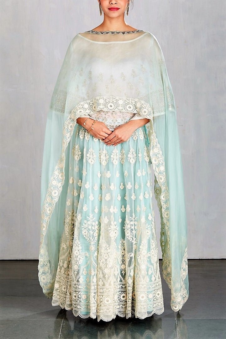 Alluring pastel blue embroidered organza cape with skirt by Kavita Bhartia for parties and special occasions. Shop online at Pure Elegance or visit our store in USA.
