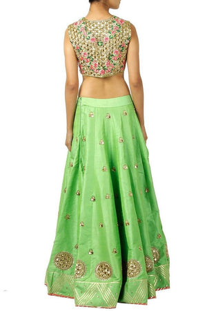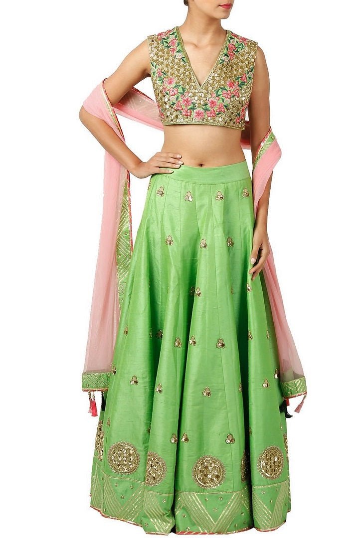 Keep your style subtle yet striking with this pastel green embroidered raw silk lehenga set! The lehenga is adorned with gota, cut tube and zari work. It is paired with a matching cut sleeves V-neck blouse with alluring floral thread embroidery and embellished detailing. It comes with a pink dupatta with contrast gota border and tassels.
