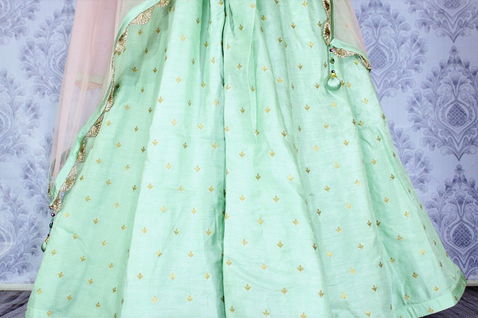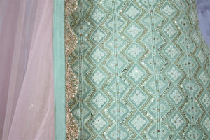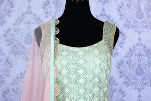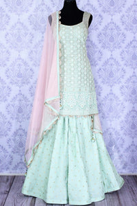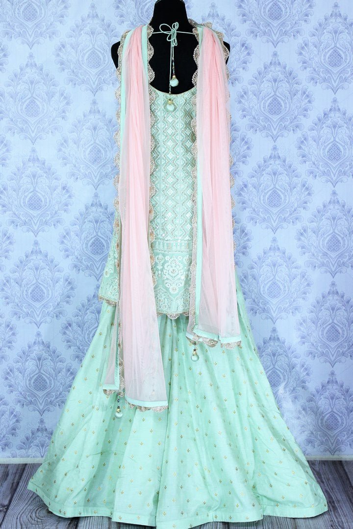 Shine in soft pastel colors of beautiful Lucknowi embroidery pastel green kurta palazzo set at weddings and special occasions. The dress comes with a pink dupatta. Shop online at Pure Elegance or visit our store in USA!