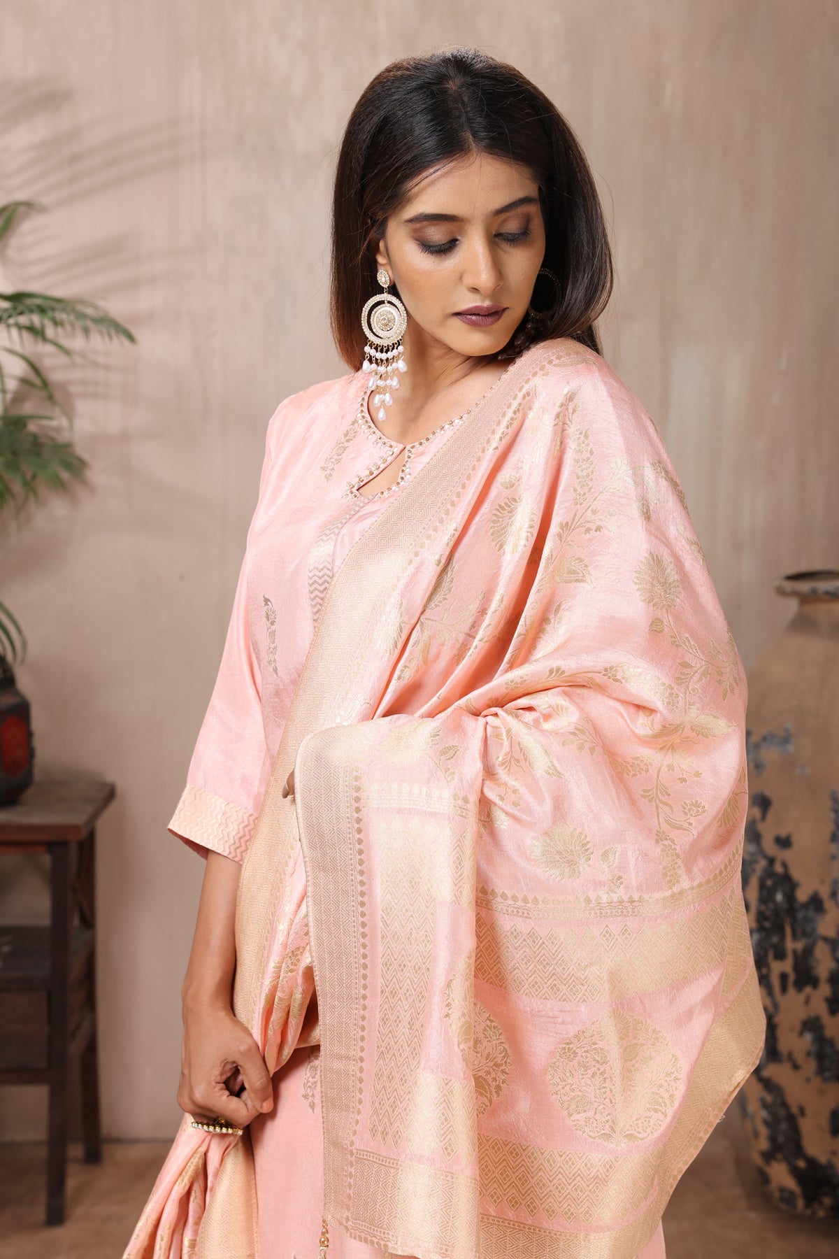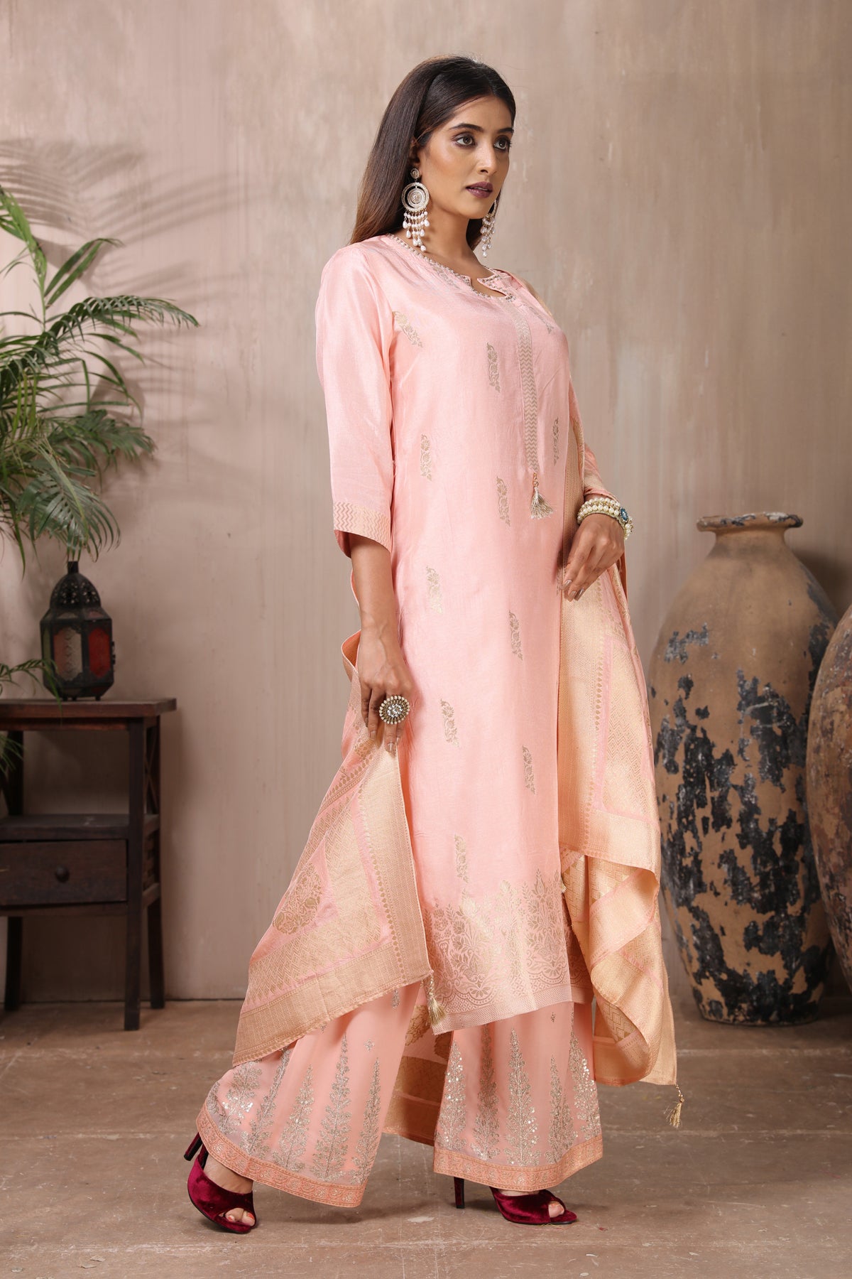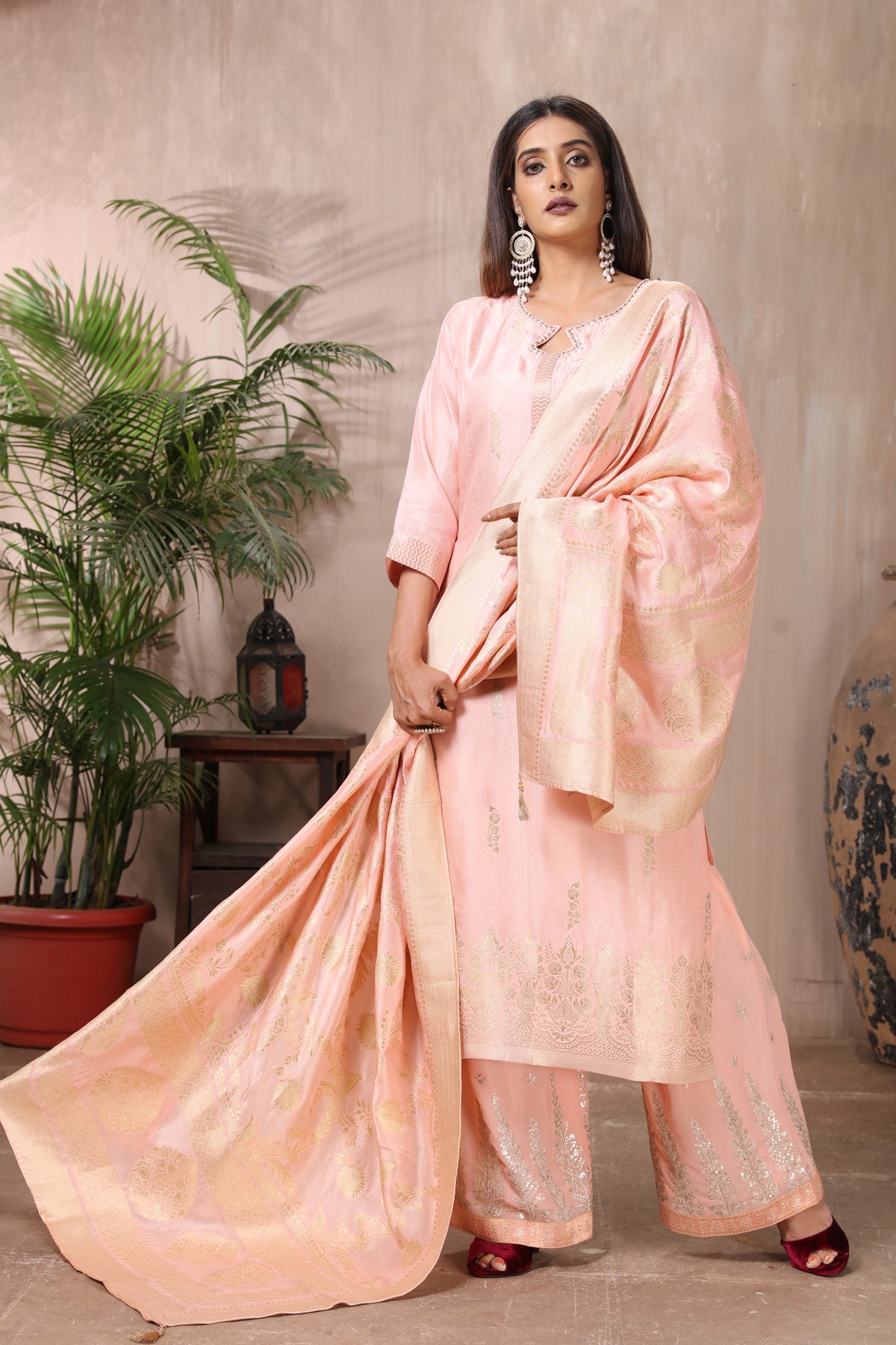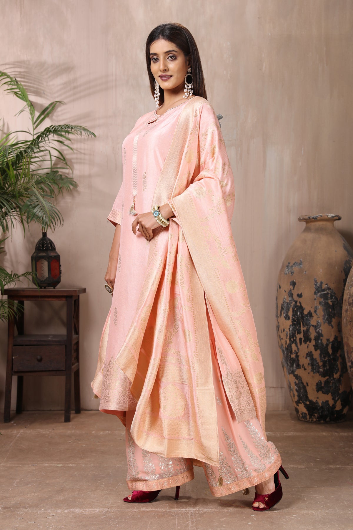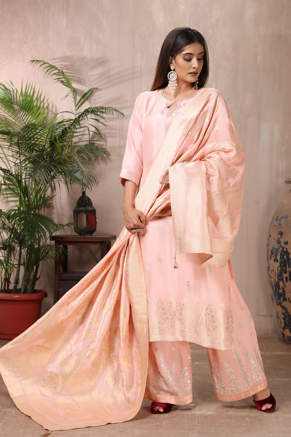Stunning pastel pink embroidered palazzo suit with dupatta is perfect for an ethnic look on festive