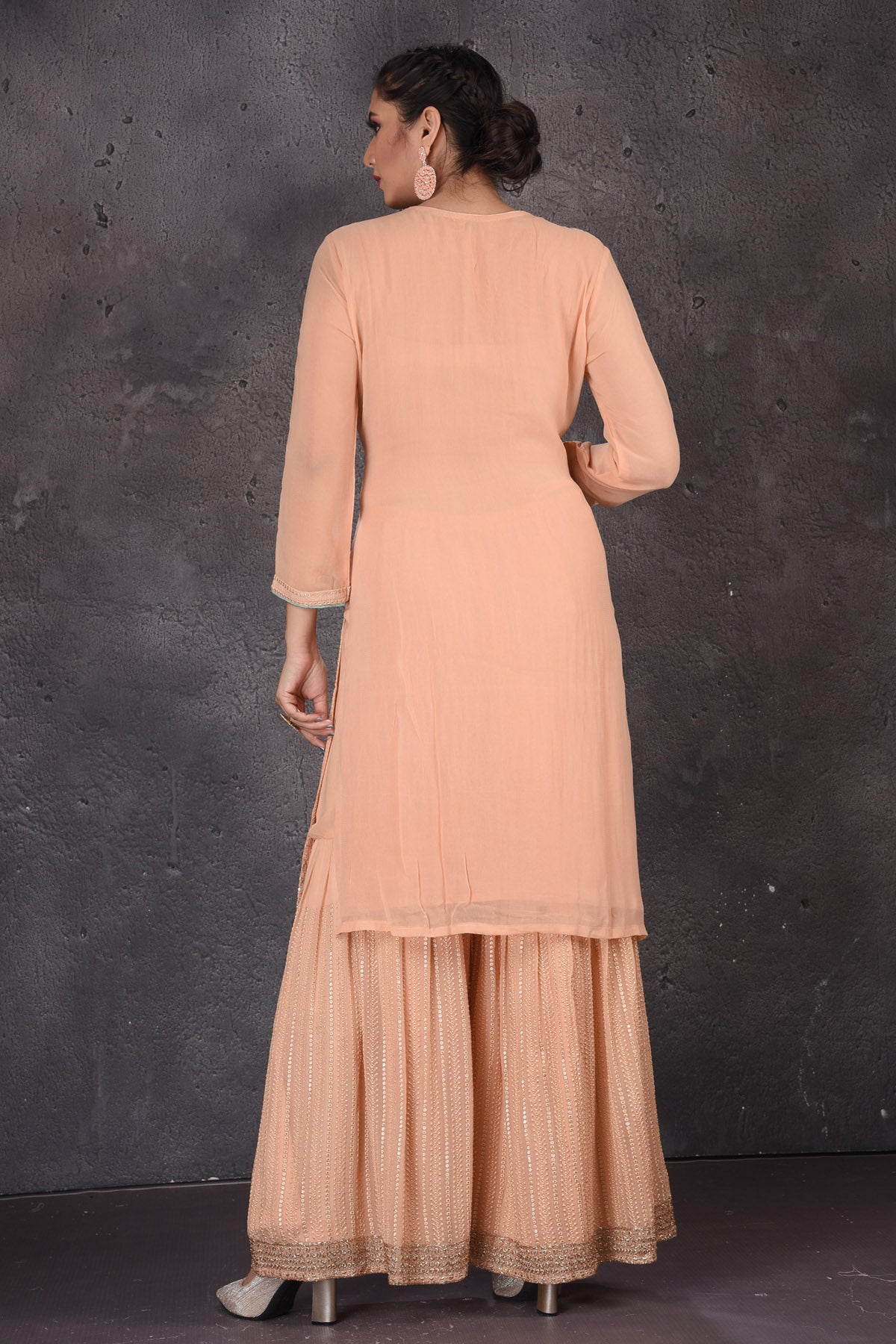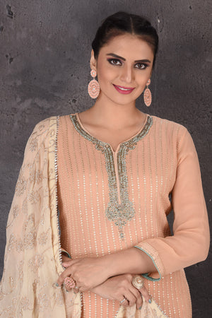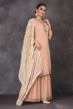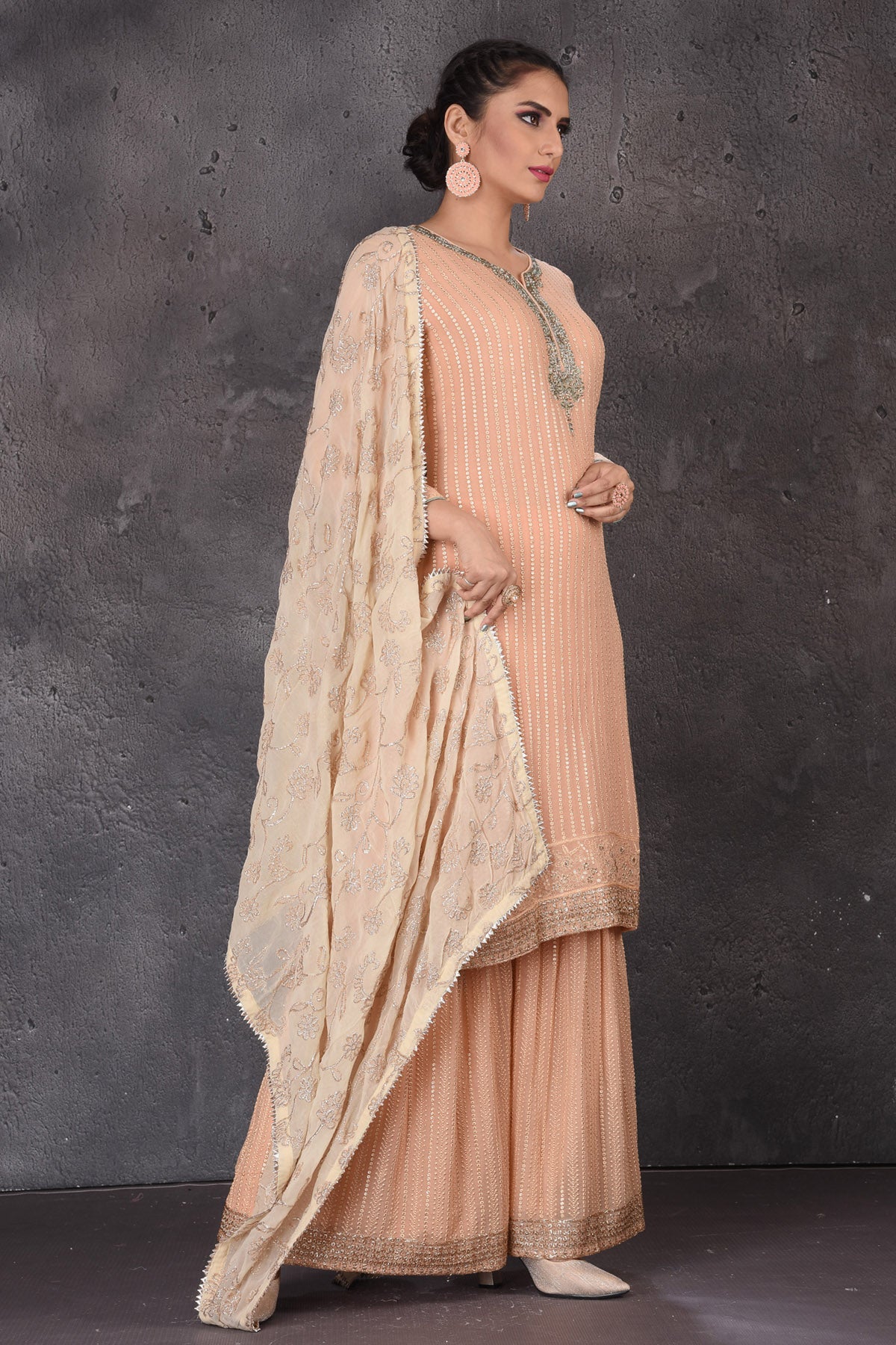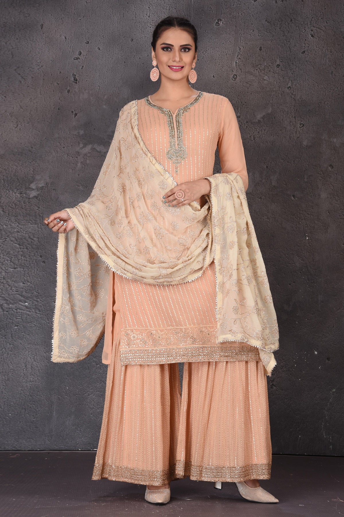 Look elegant on festive occasions in this beautiful peach embroidered palazzo suit with dupatta. Shop designer suits in USA from Pure Elegance.