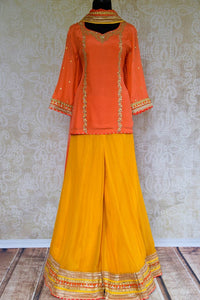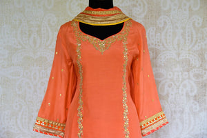 Perfect summer festive peach chanderi embroidered kurti with yellow palazzo is a great choice for a feminine look. It is delicately embroidered with gota patti work which highlights the soft a colors perfectly. It comes with a peach embroidered dupatta. Buy online from Pure Elegance or visit our store in USA!