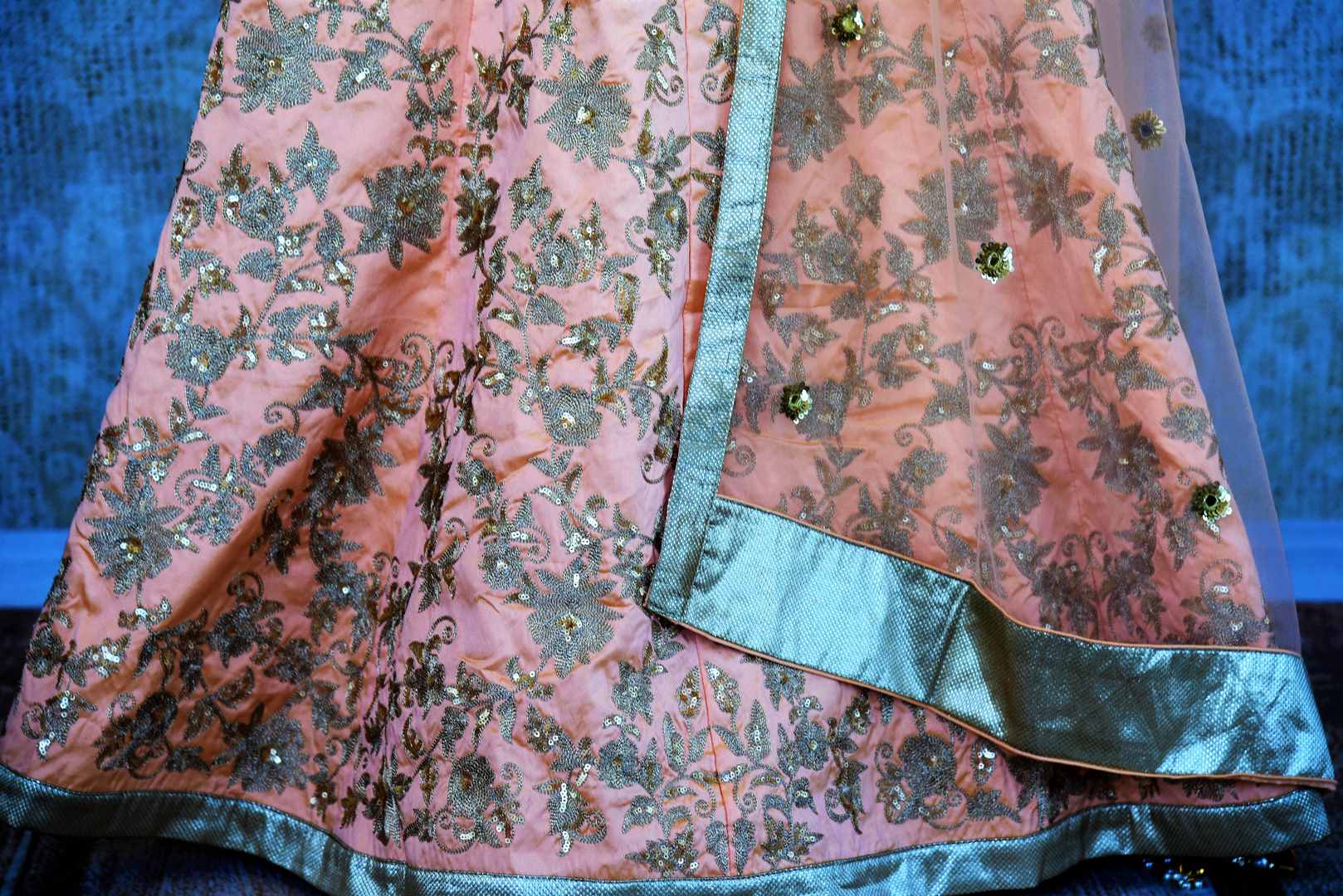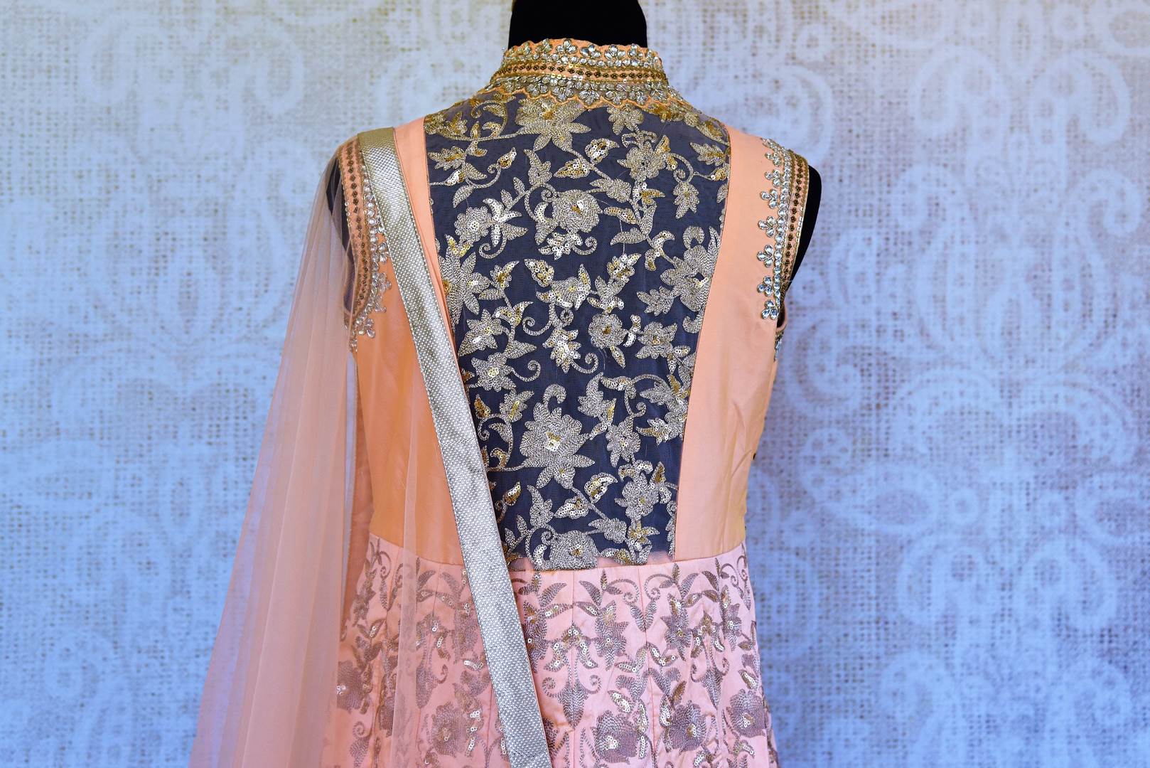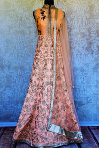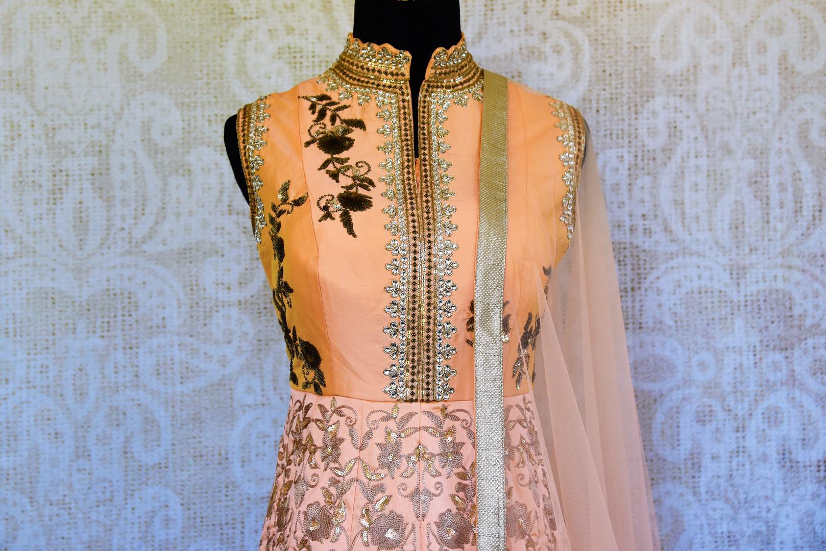 Beautiful peach embroidered designer raw silk Anarkali suit with overall embroidery will be an exquisite piece in your ethnic wardrobe. The suit has beautiful floral embroidery and is decorated with gold lace border and stylish sheer back adds visual interest to the design. It comes with a matching dupatta. Perfect pick for weddings and parties! Buy online from Pure Elegance in USA!