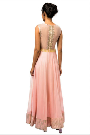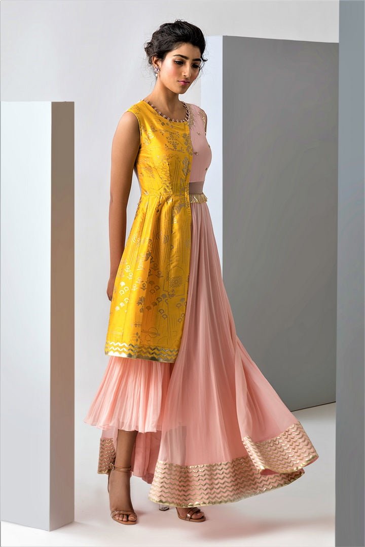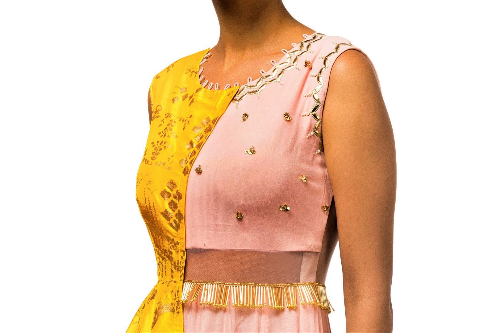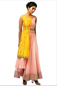Be a dazzler at parties and festive occasions with this captivating pink embroidered Anarkali dress with yellow attached drape. The dress is beautifully embroidered and is crafted in georgette.