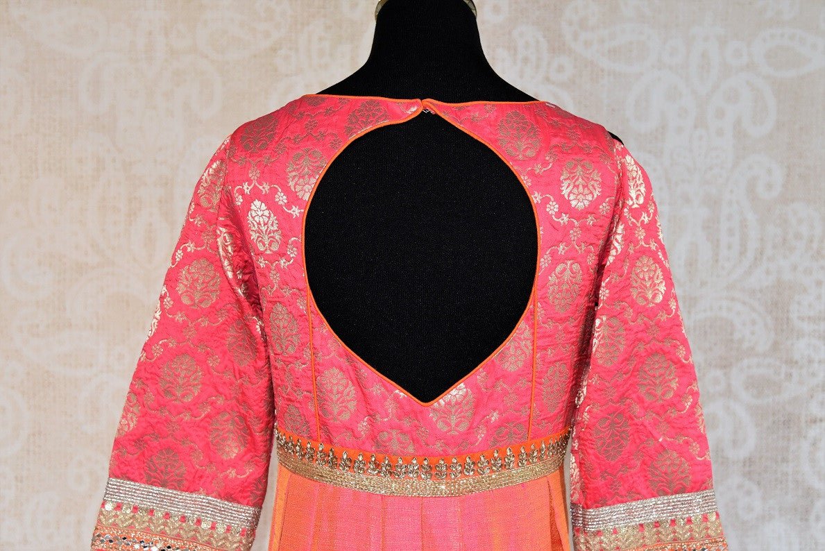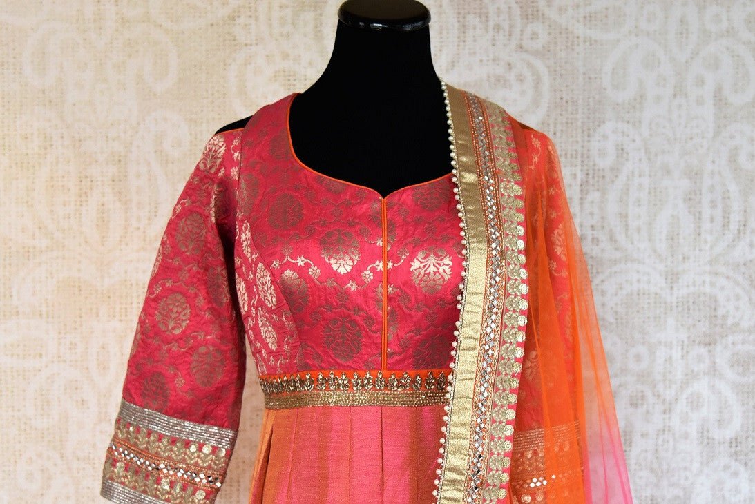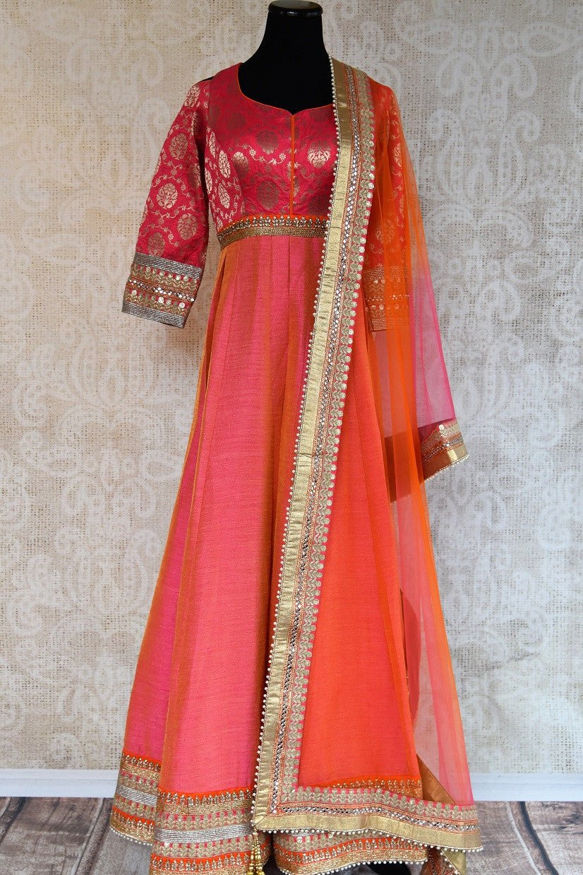 Buy this elegant and eye catching pink banarasi silk floor length indian dress suit with dupatta from pure elegance store and online. The anarkali top and silk dupatta border are embellished with woven silver and gold work.Great for parties and festive occasions.