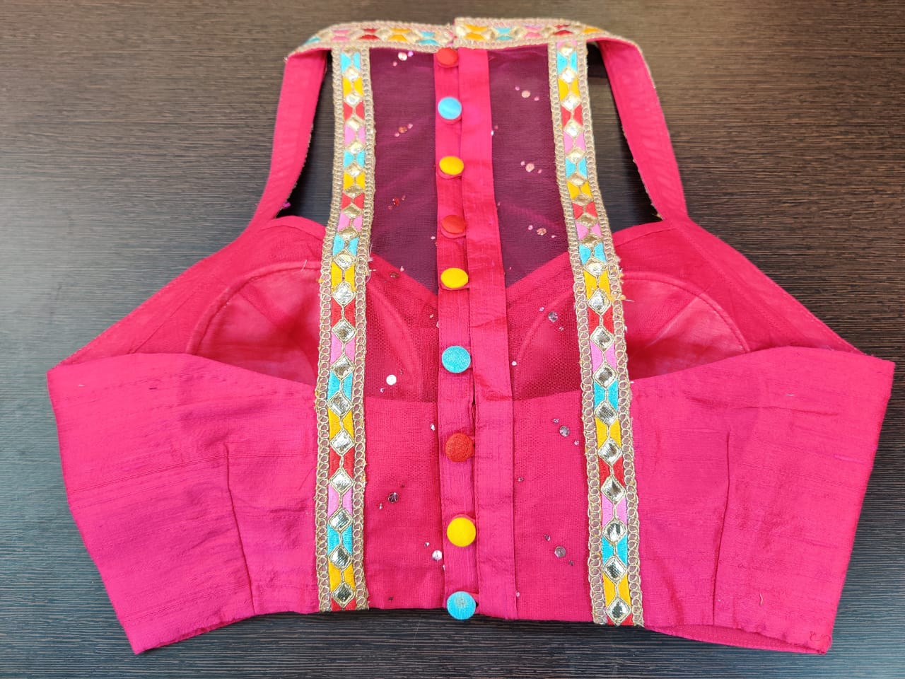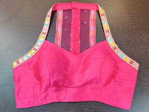 Stunning pink designer faux halter neck saree blouse. Buy designer blouse in USA from Pure Elegance.