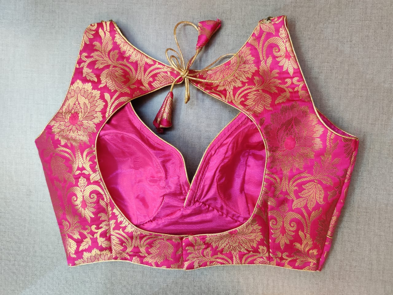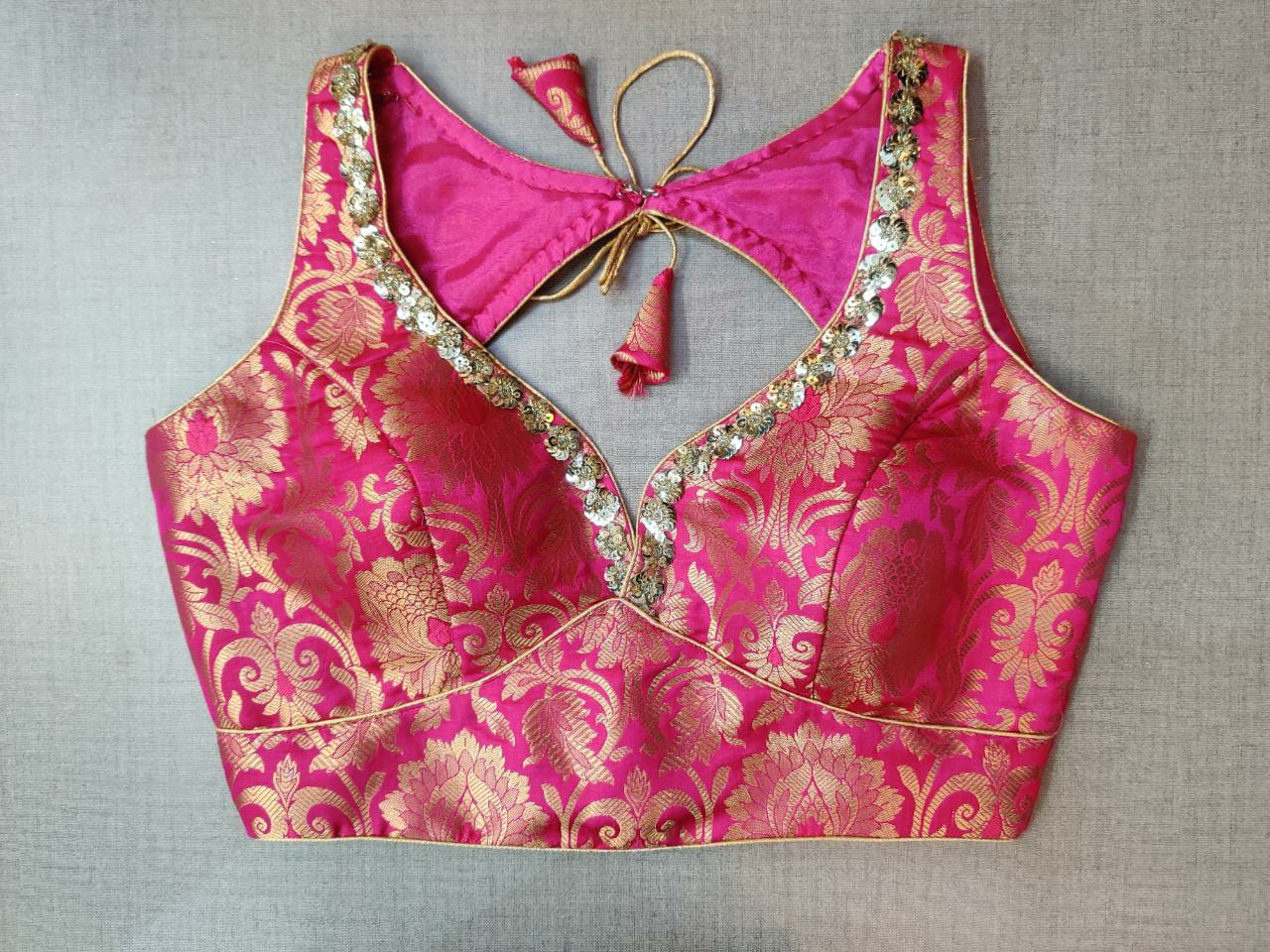 Beautiful pink embroidered Banarasi sleeveless saree blouse. Buy designer blouse in USA from Pure Elegance.