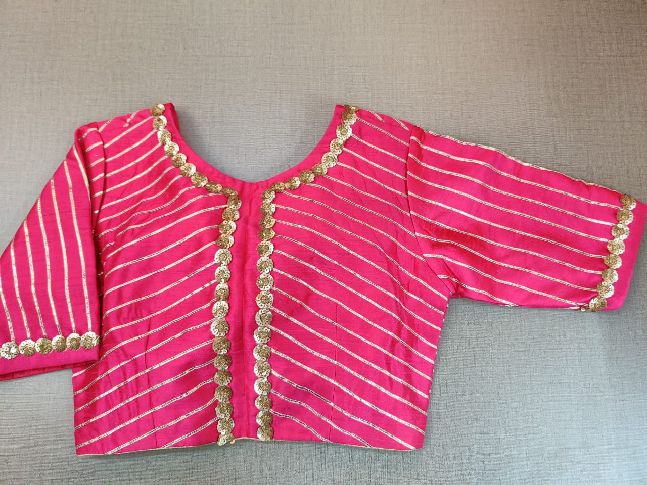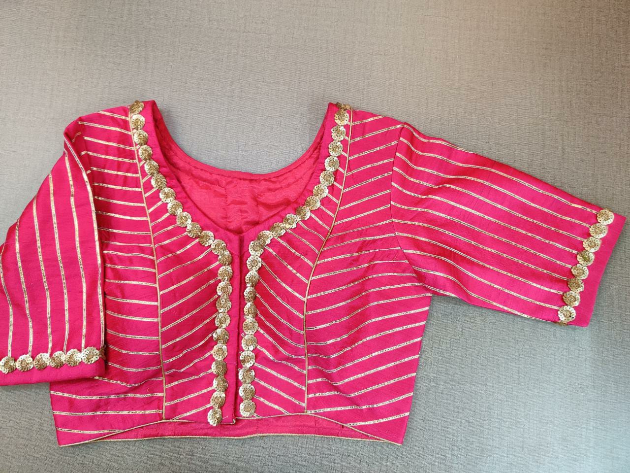 Beautiful pink embroidered sari blouse with gota work . Buy designer blouse in USA from Pure Elegance.