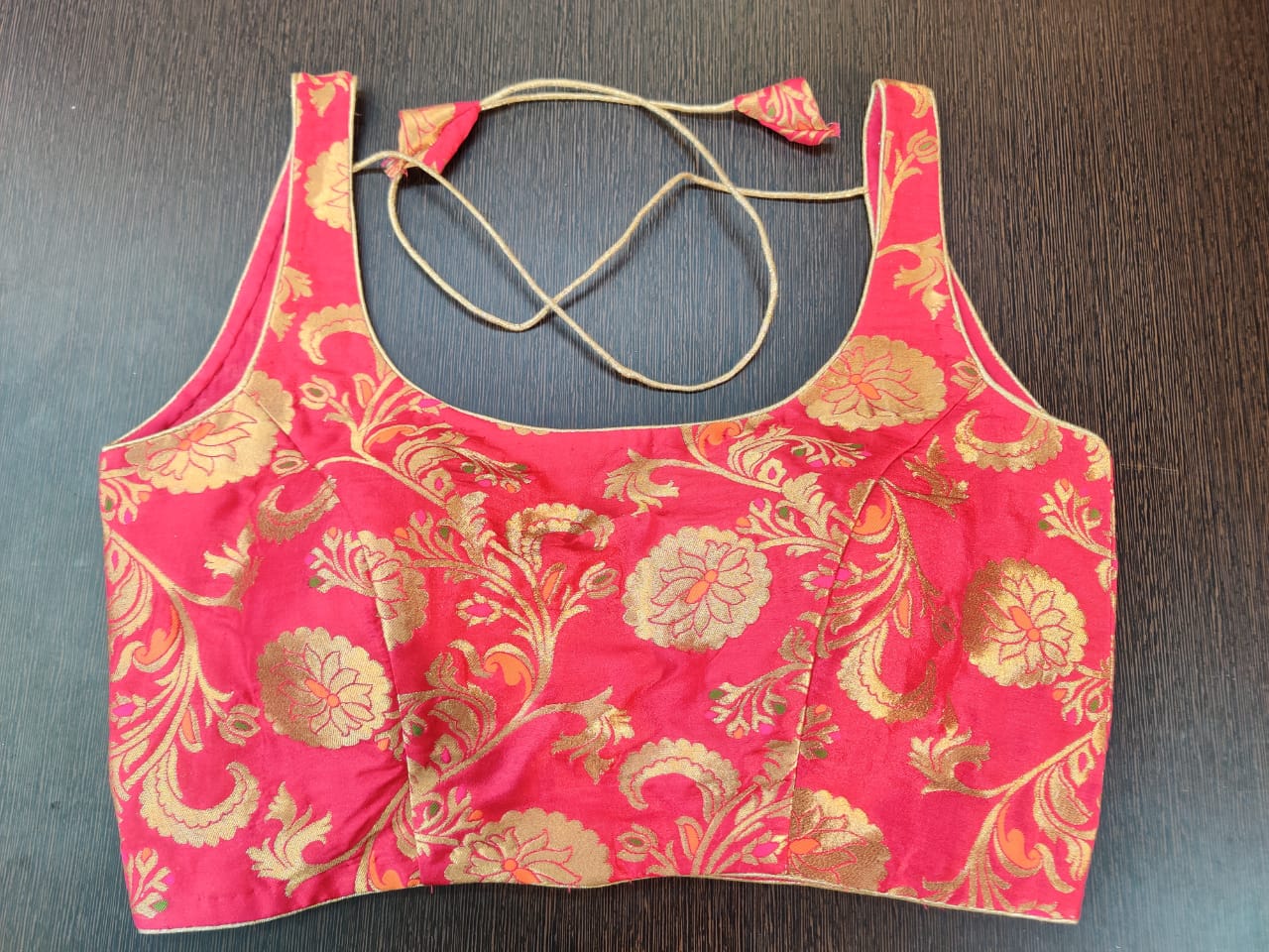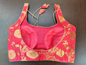 Gorgeous pink readymade Banarasi sleeveless saree blouse. Buy designer blouse in USA from Pure Elegance.