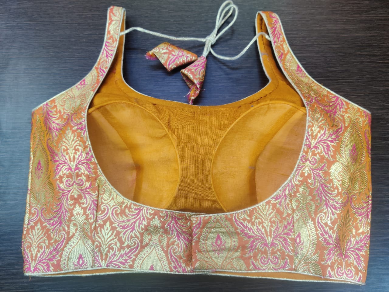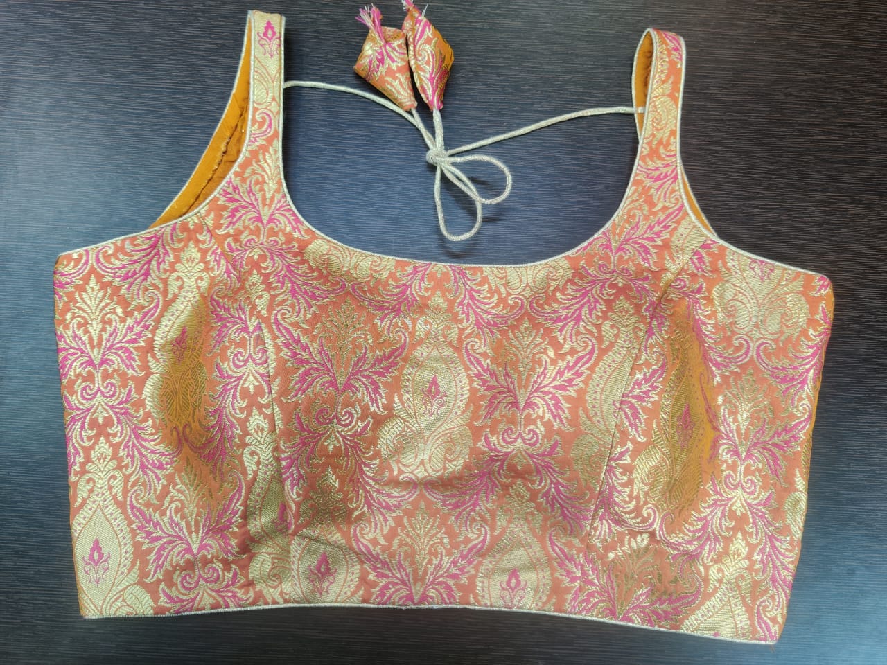Stunning pink sleeveless readymade Banarasi saree blouse. Buy designer blouse in USA from Pure Elegance.