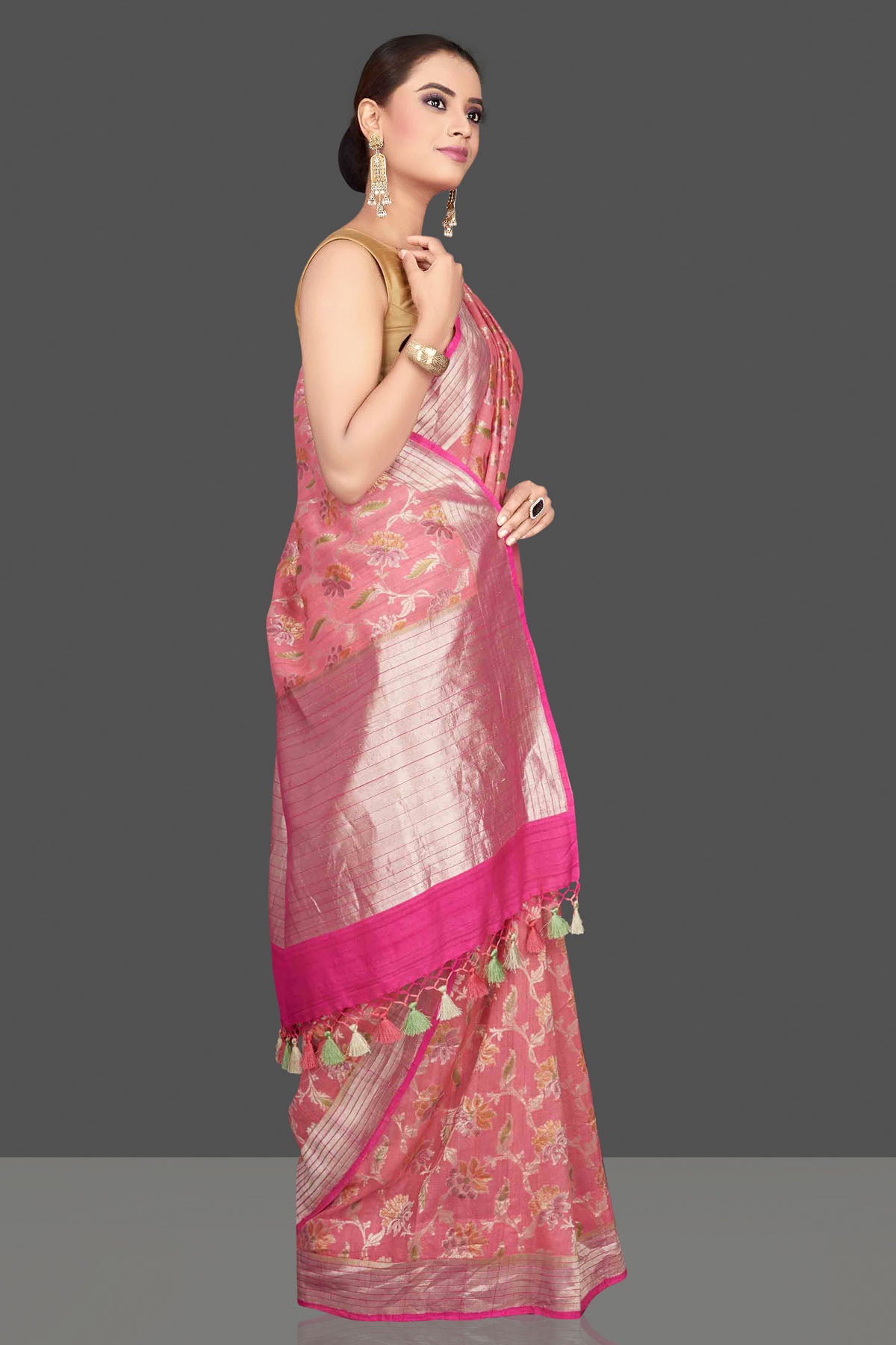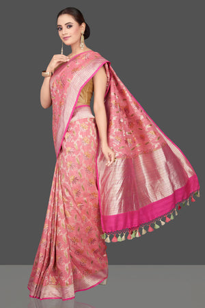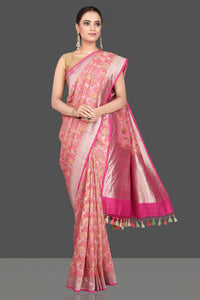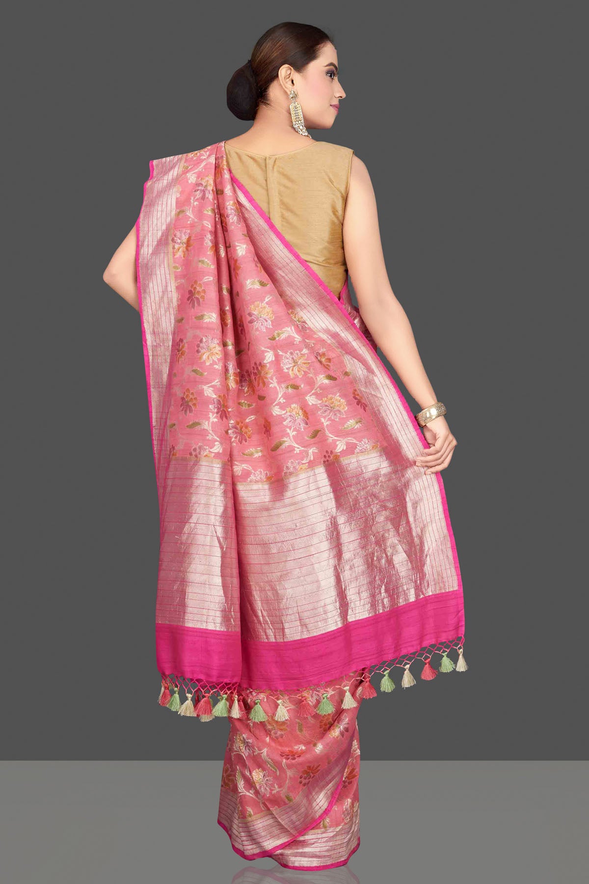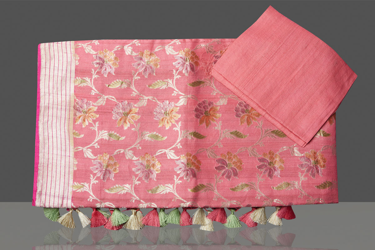 Look attractive on special occasions in this beautiful pink tussar georgette saree with floral zari jaal. It comes with a matching blouse piece. Shop online from Pure Elegance.