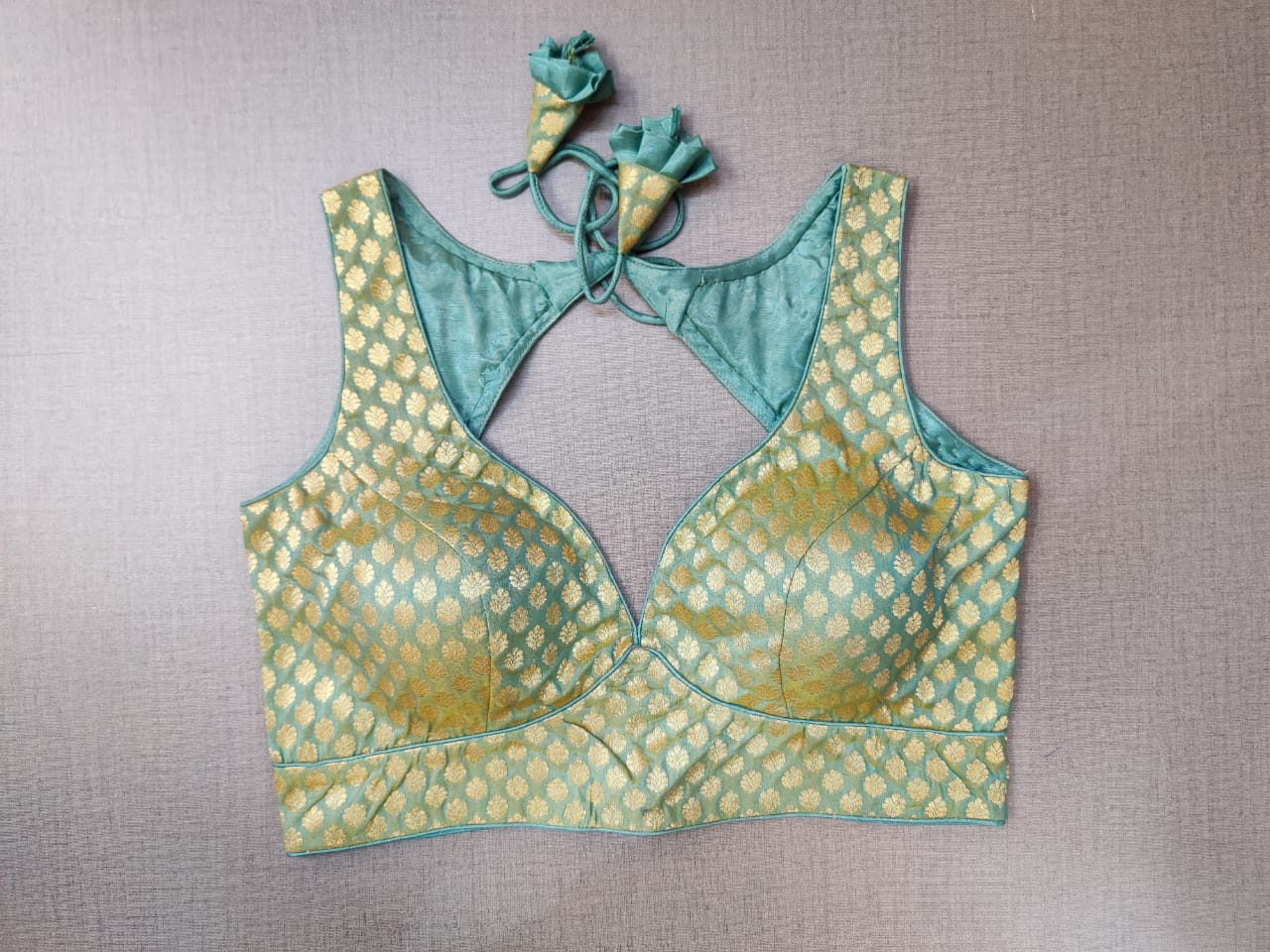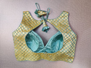 Beautiful pista green Banarasi sleeveless saree blouse. Buy designer blouse in USA from Pure Elegance.