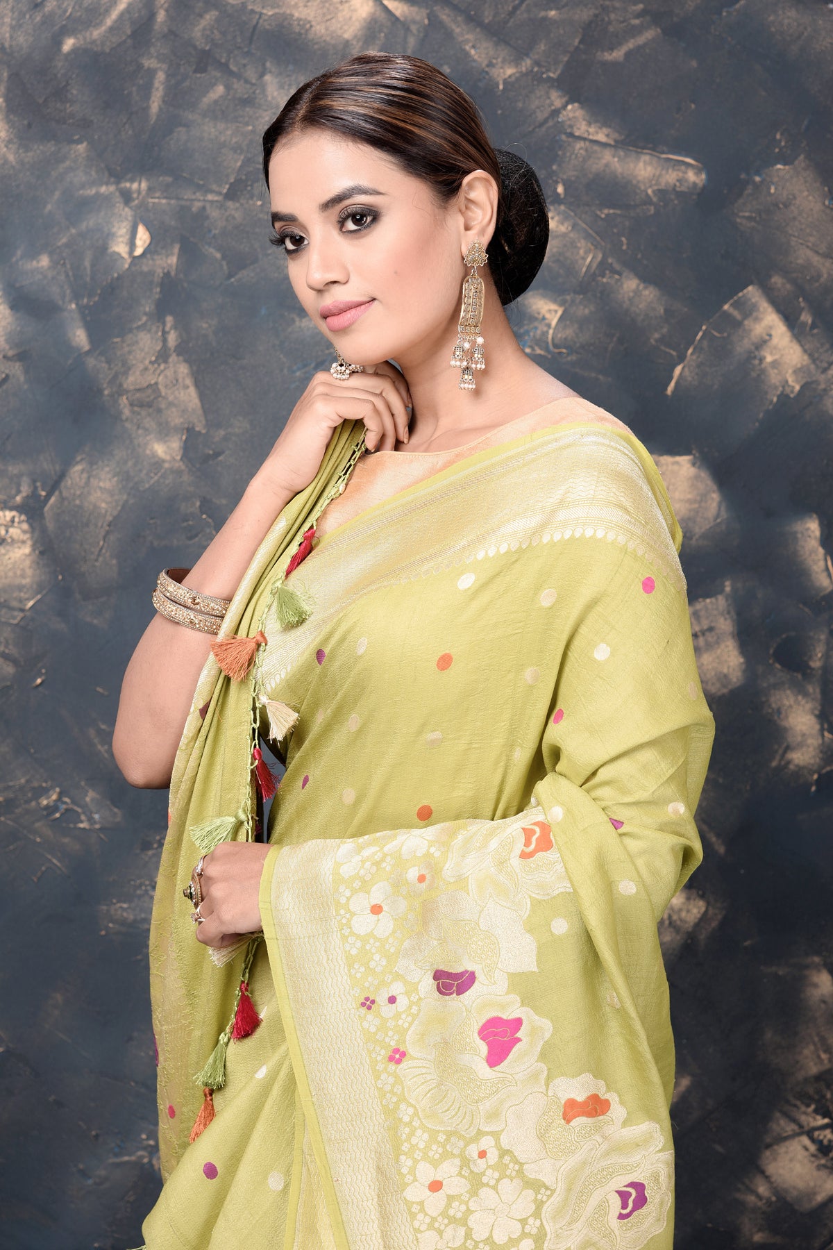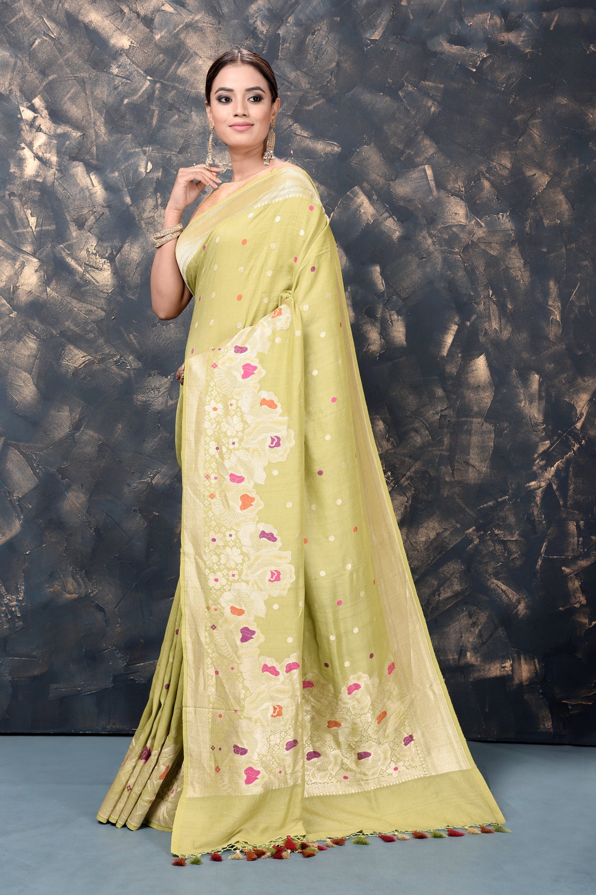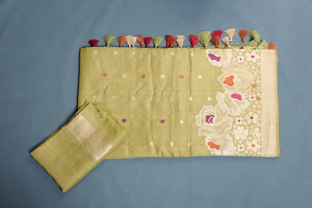 Be the talk of the occasion in this beautiful pista green georgette tussar Paithani silk saree with zari border! It comes with a matching blouse piece. Shop tussar sarees in USA from Pure Elegance.