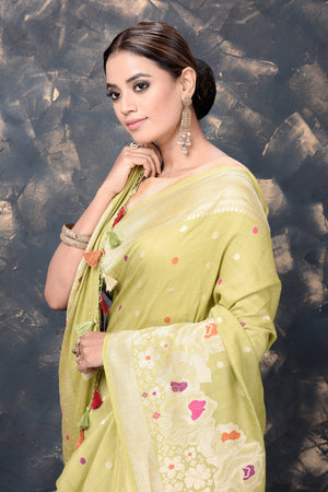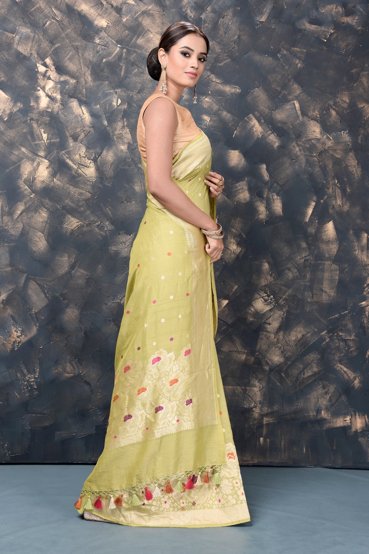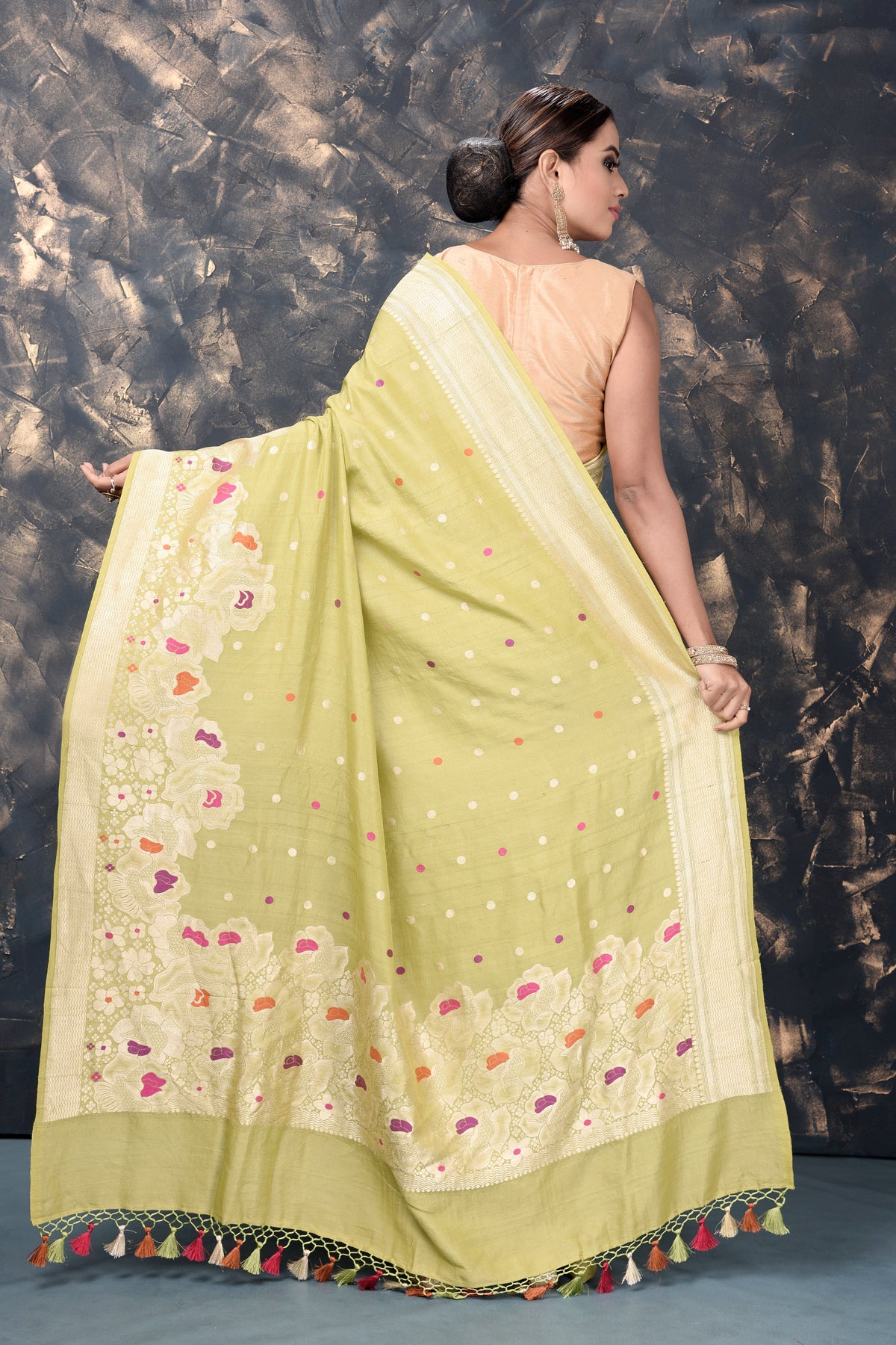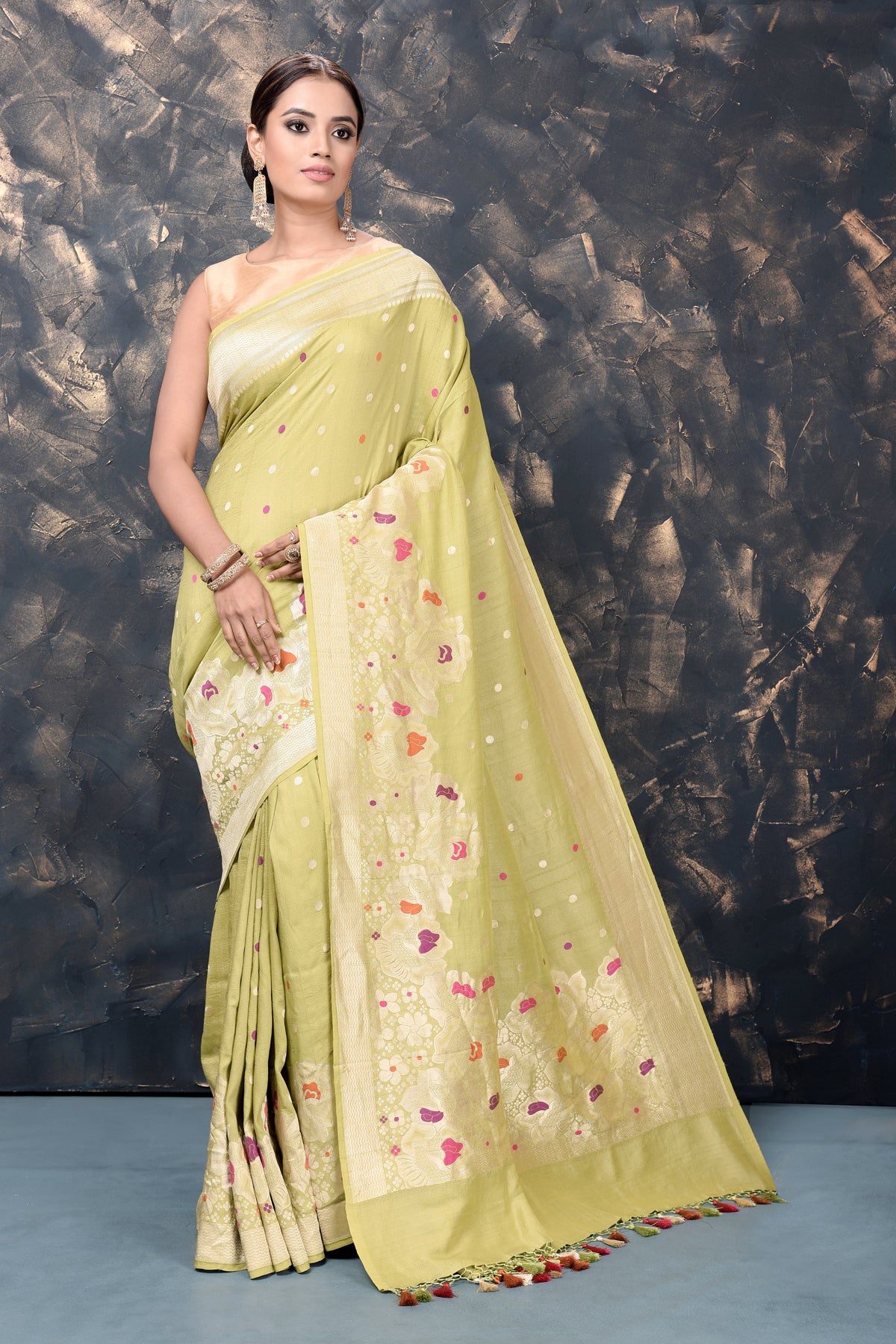Be the talk of the occasion in this beautiful pista green georgette tussar Paithani silk saree with zari border! It comes with a matching blouse piece. Shop tussar sarees in USA from Pure Elegance.