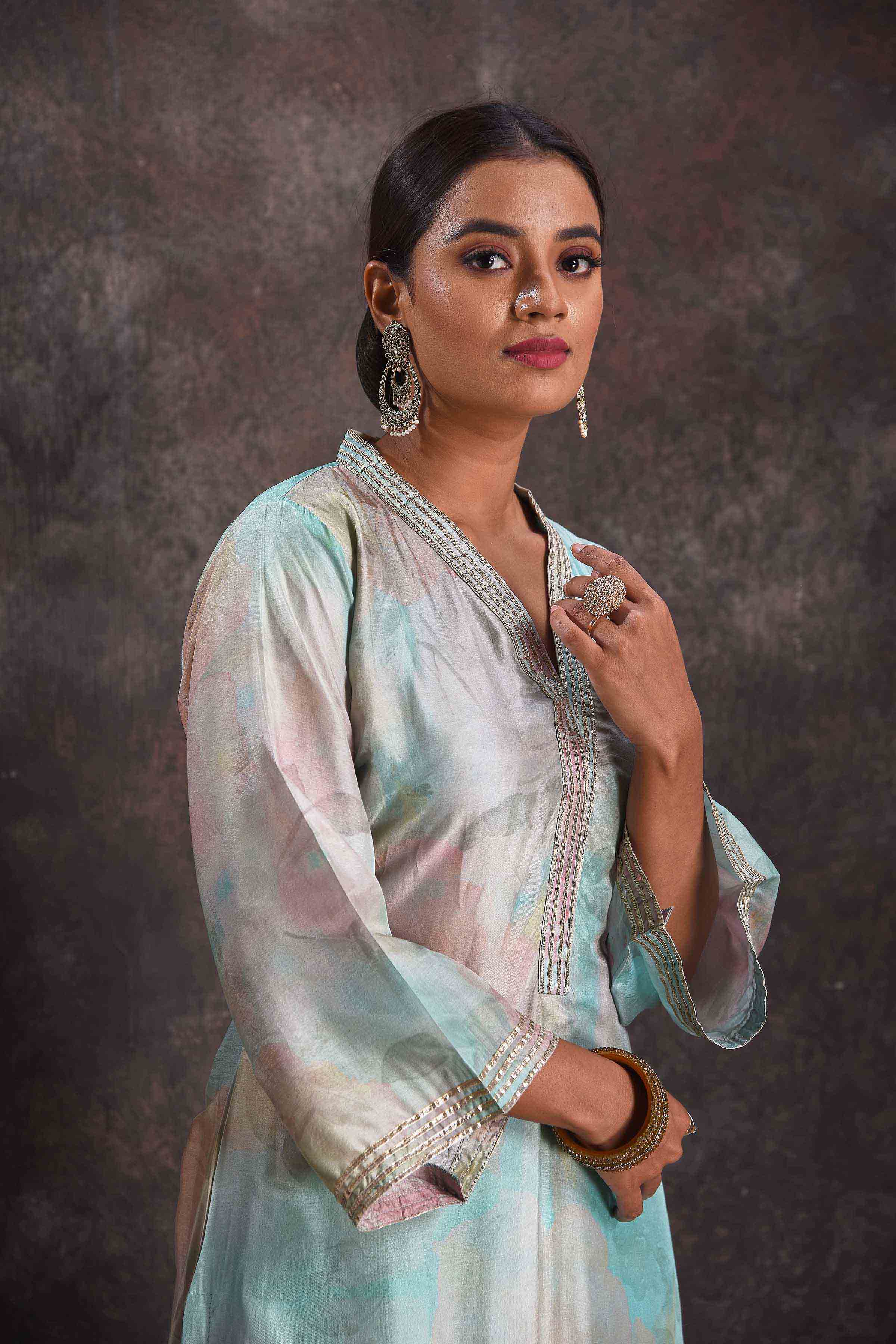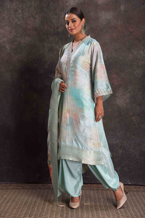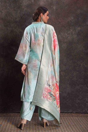 Get set to dazzle on festive occasions in this beautiful powder blue floral print salwar suit. It comes with a matching dupatta.