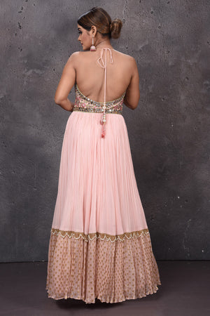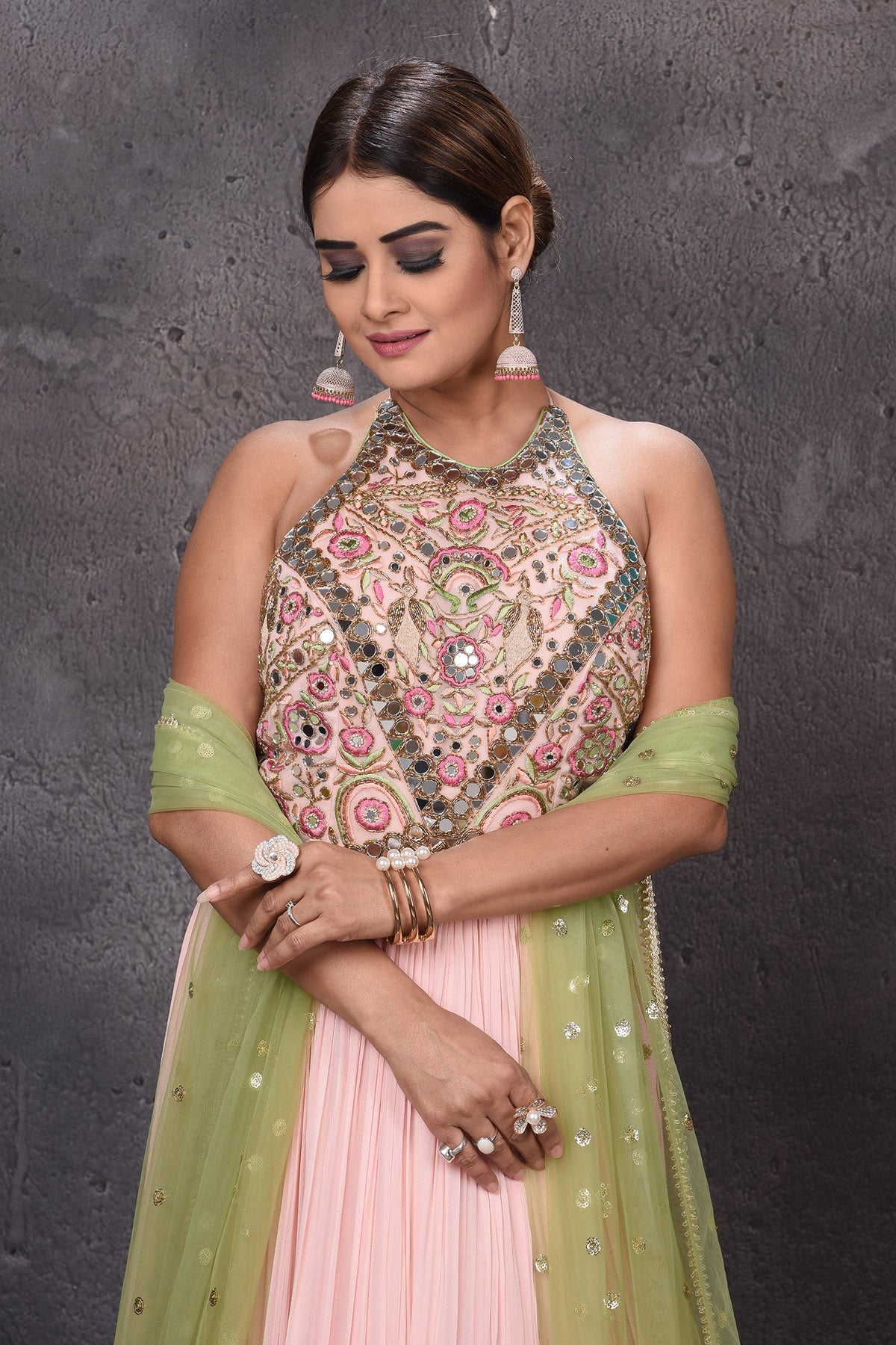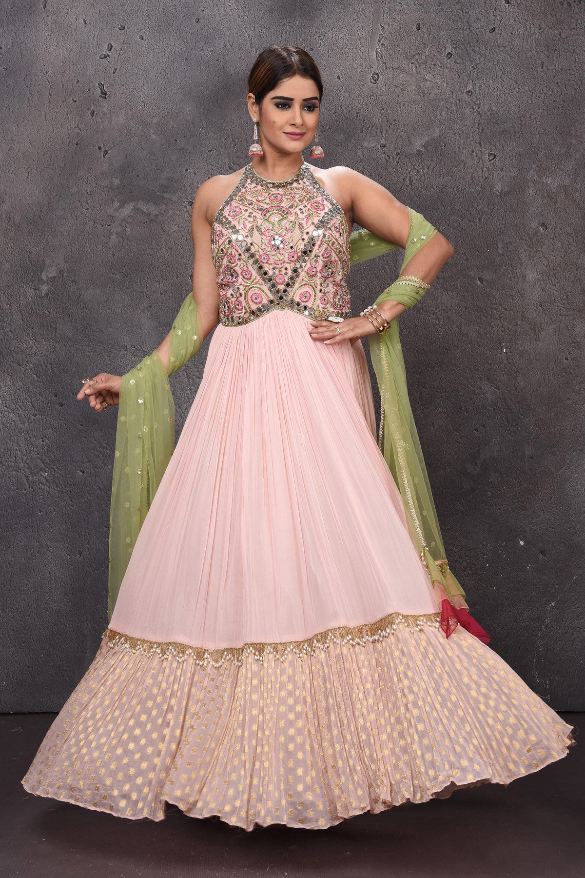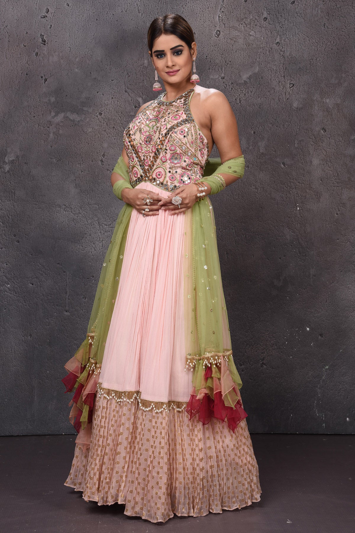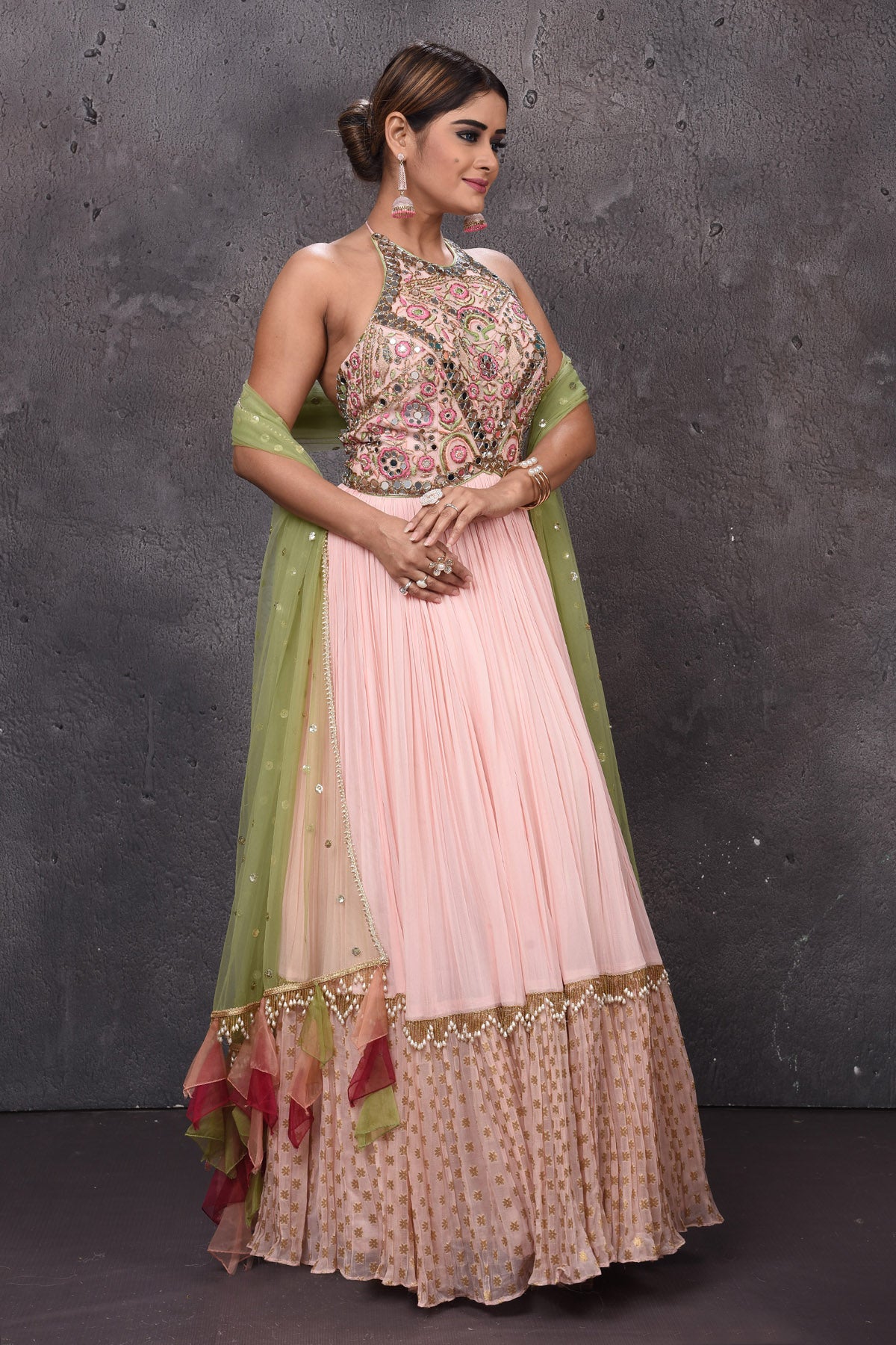 Go for chic and stylish look at weddings in this beautiful powder pink designer lehenga with green dupatta! Shop designer lehengas in USA from Pure Elegance.