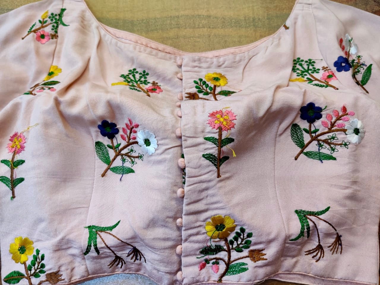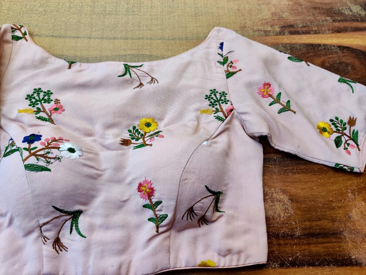 Gorgeous powder pink embroidered designer saree blouse. Buy online from Pure Elegance