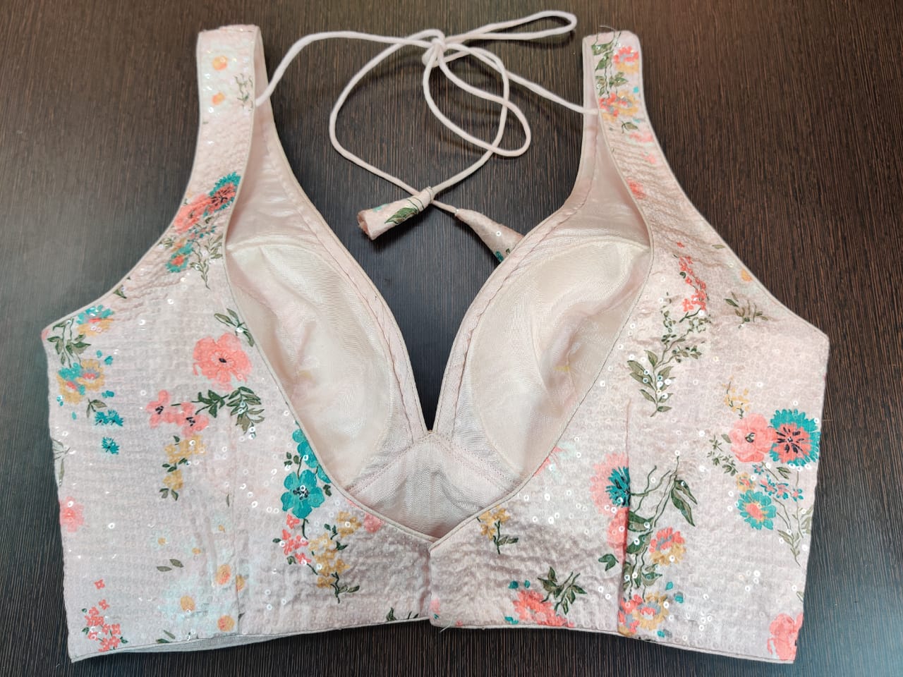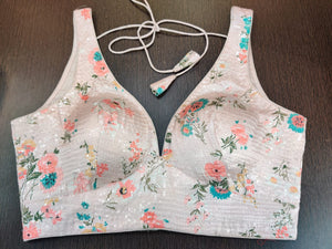 Gorgeous powder pink sequin work floral sleeveless saree blouse. Buy designer blouse in USA from Pure Elegance.