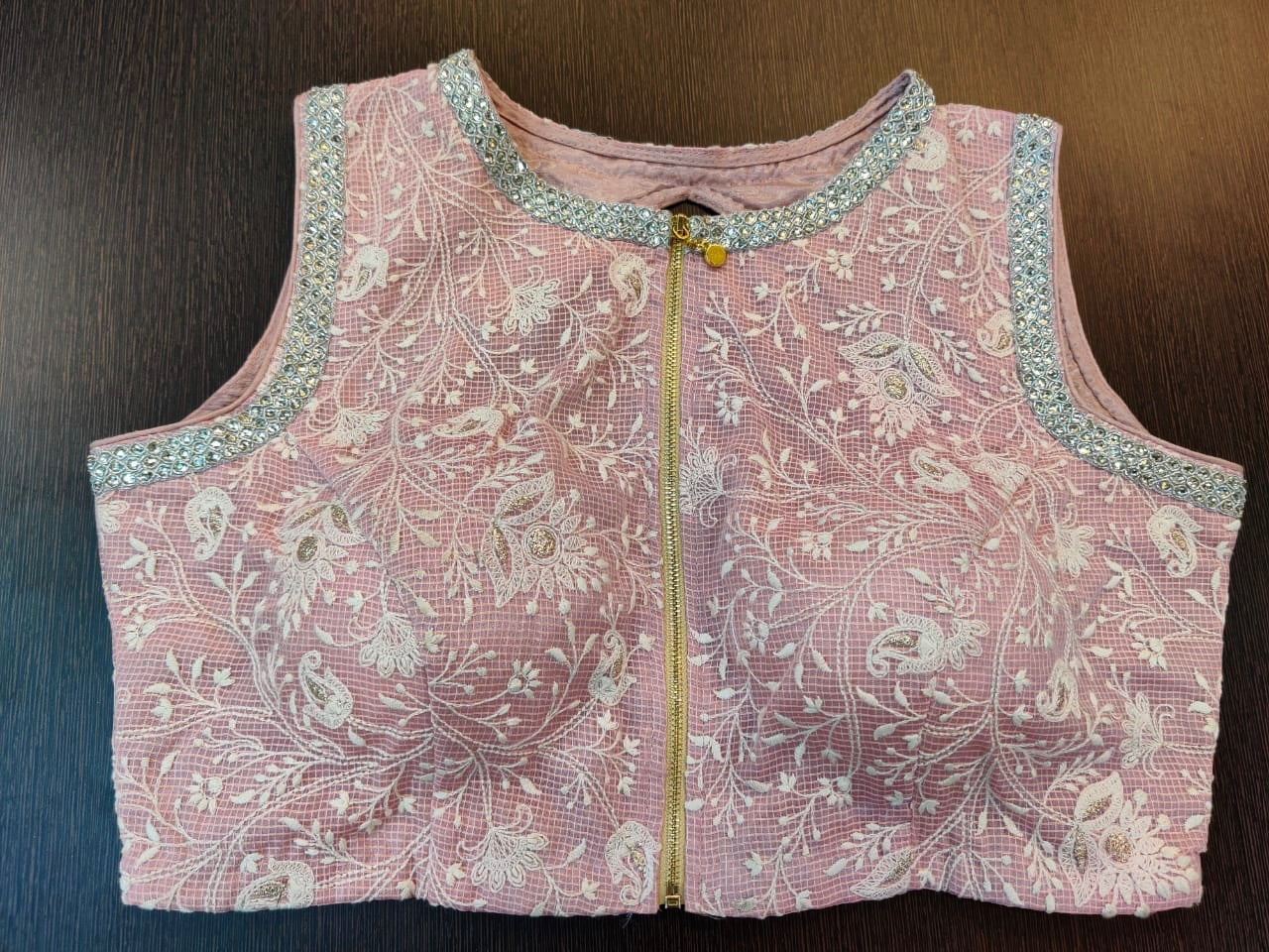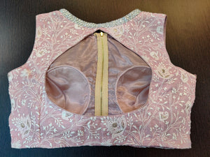 Stunning powder pink sleeveless saree blouse with floral embroidery. Shop designer saree blouse online in USA from Pure Elegance.