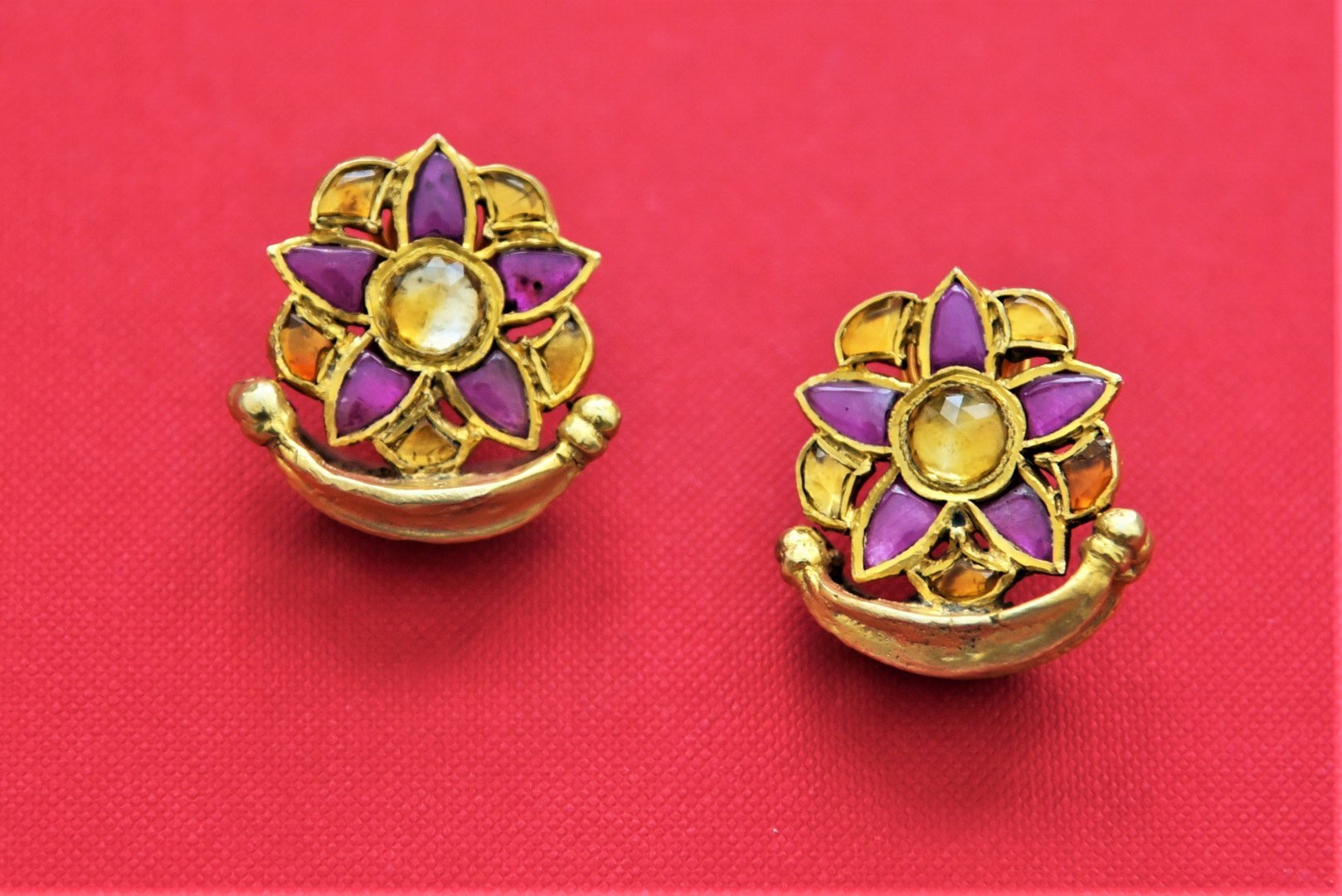 Enhance your ethnic style with purple and yellow stone floral gold plated studs. Shop gold plated jewelry in USA from Pure Elegance.