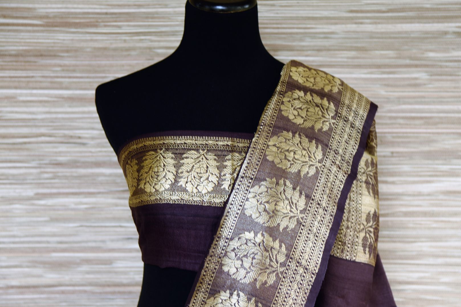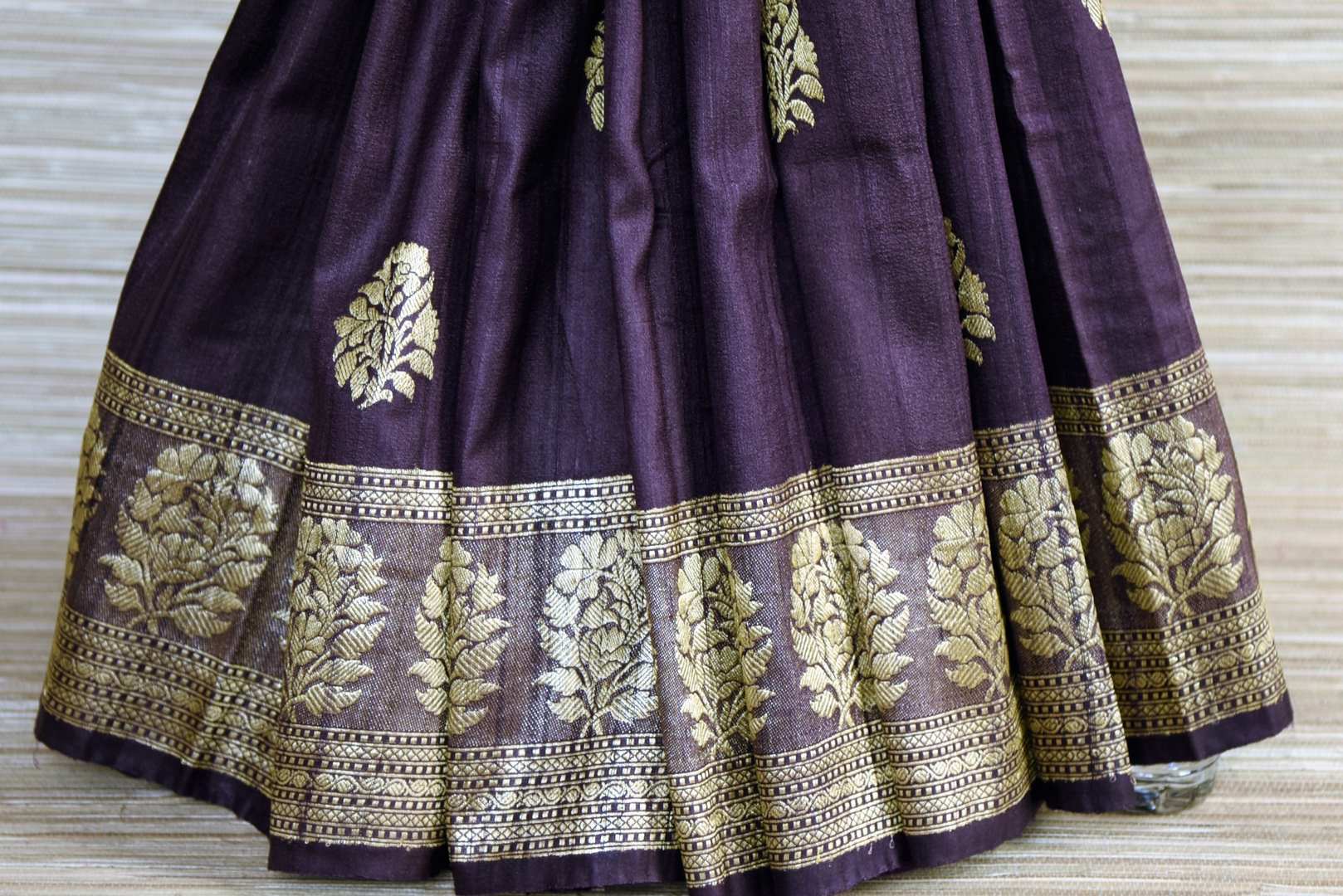 Look classy and elegant in this gorgeous purple tussar Banarasi saree on special occasions! The saree has a contrasting foliate zari border and zari buta. It comes with a matching blouse piece. Shop online from Pure Elegance.