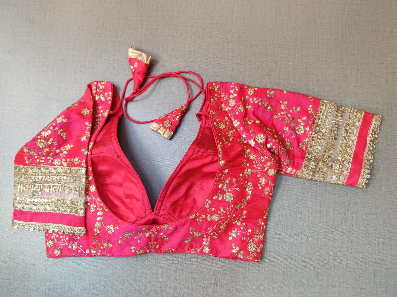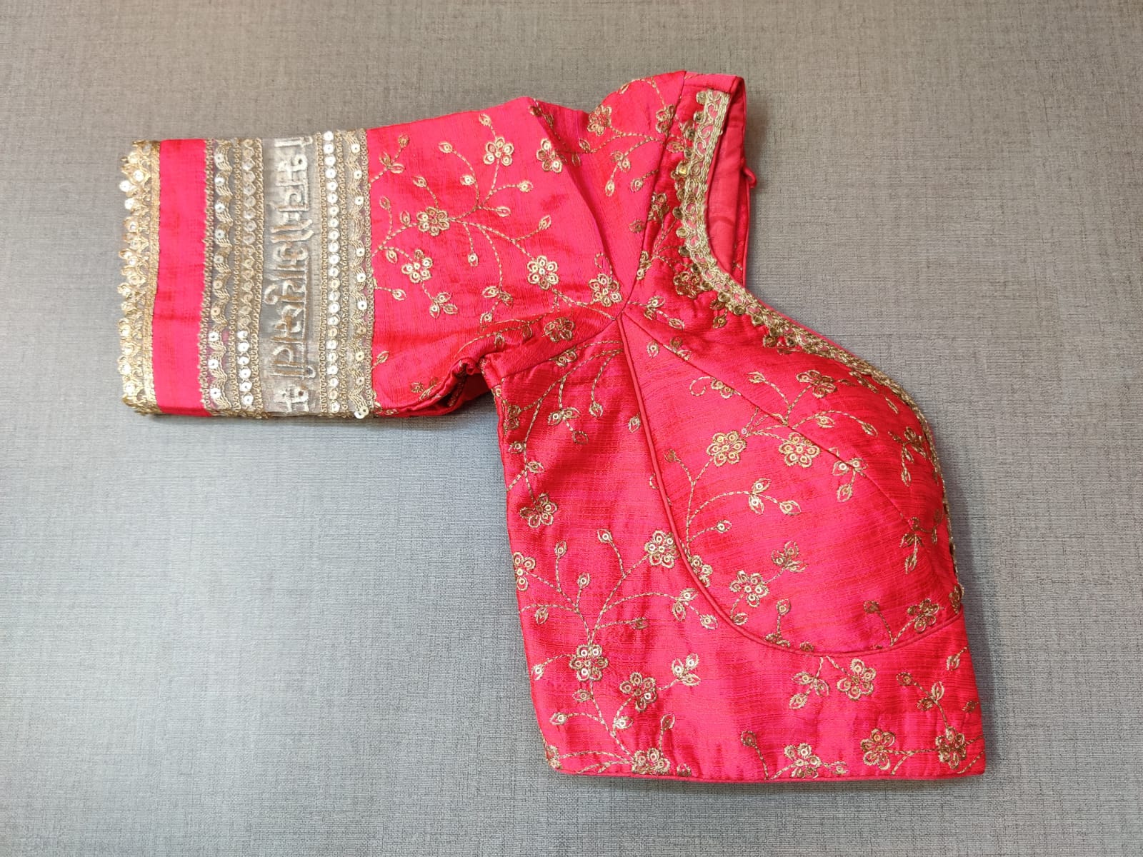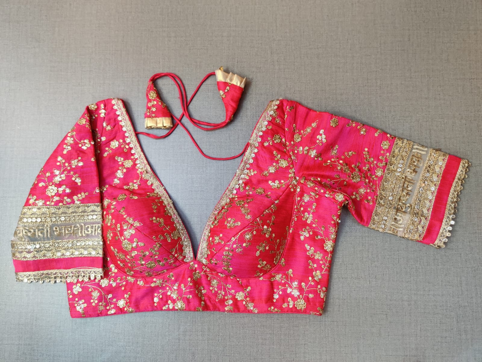 Pair rani pink embroidered designer saree blouse with golden lace border. Buy readymade saree blouse in USA from Pure Elegance..