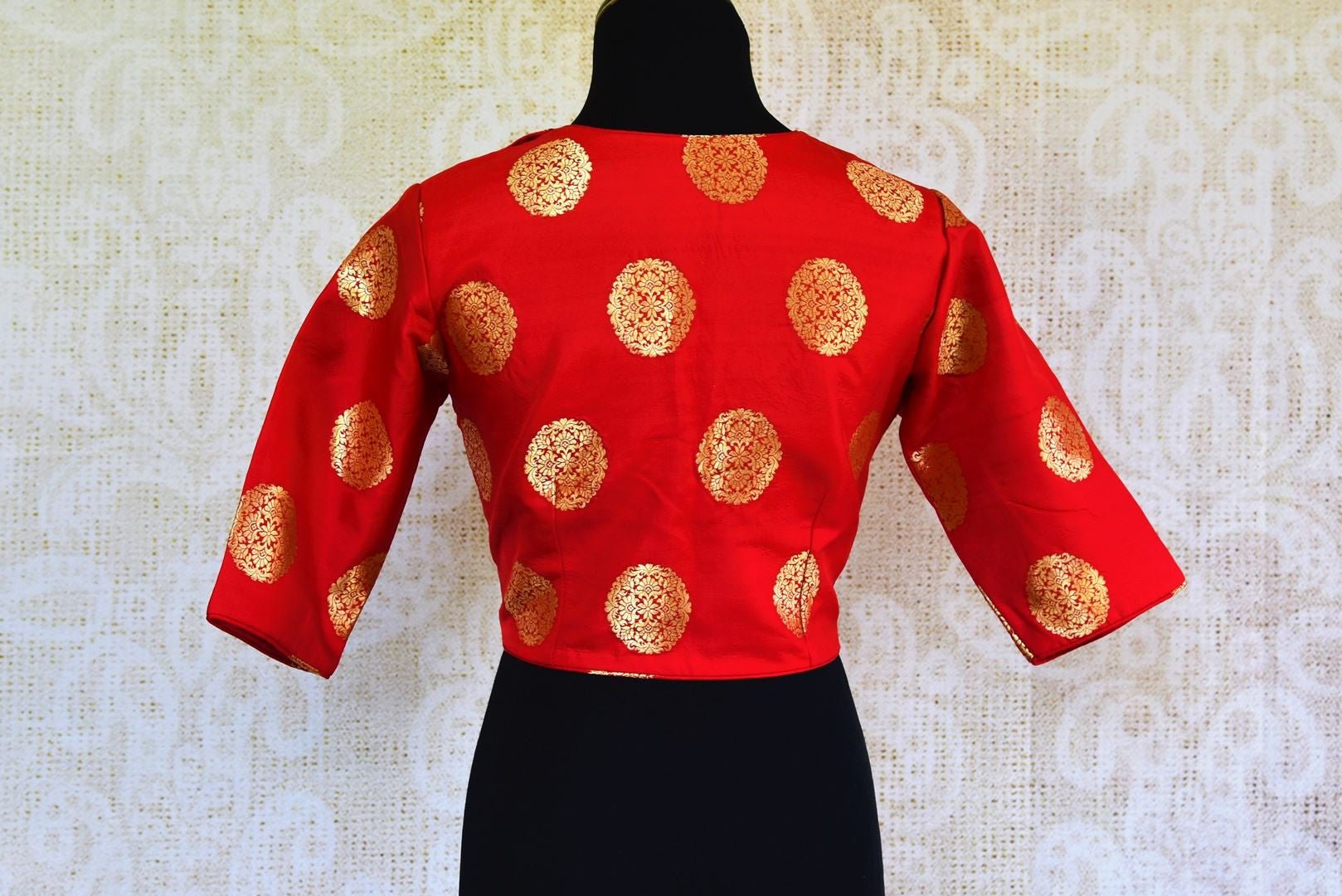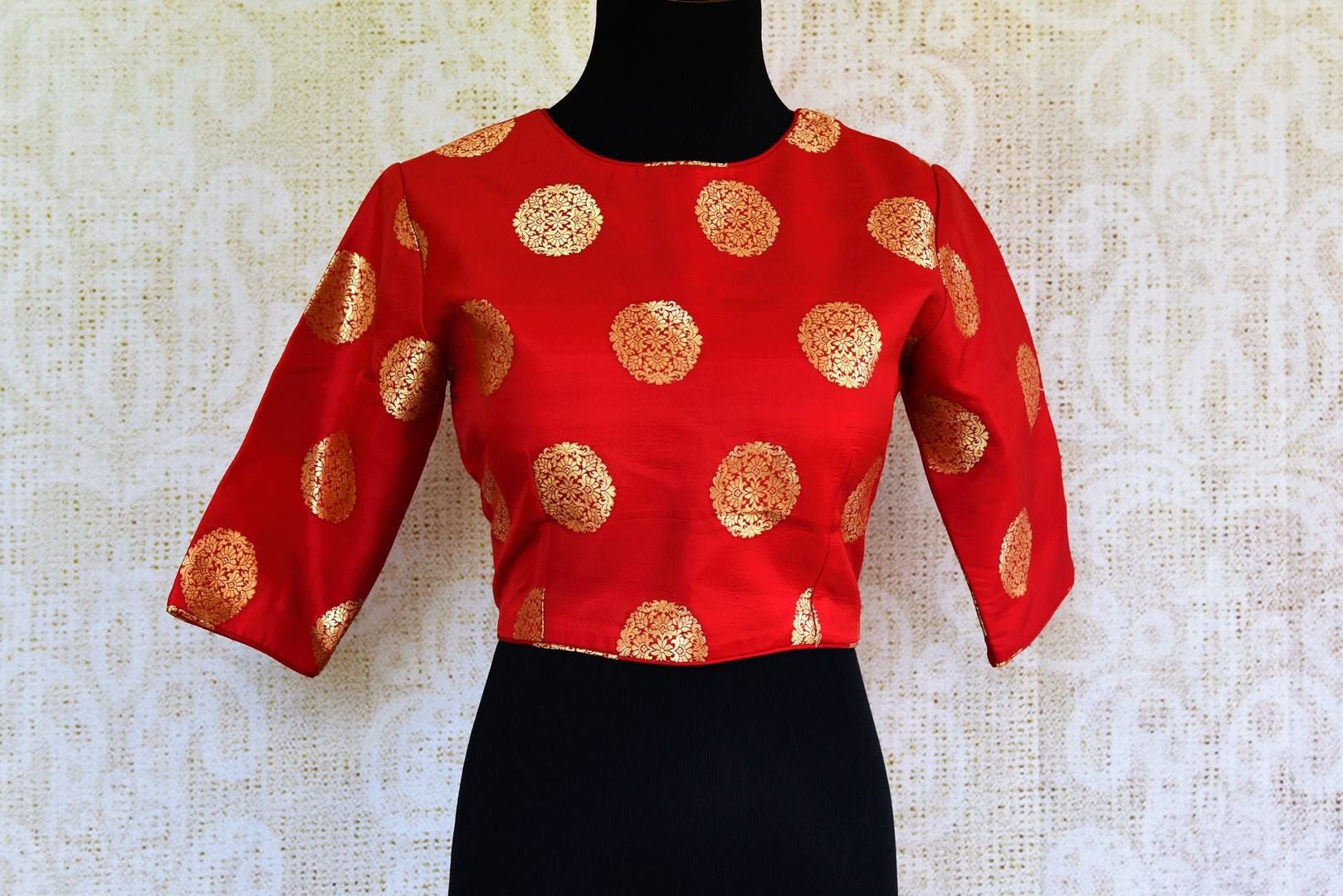 Bright red high neck blouse can amp up any simple saree. The beautiful intricate floral buta decorate the blouse brilliantly making it an elegant choice for weddings and festivals. Wear it with a black or navy blue saree and you are good to go. Buy it online from Pure Elegance or visit our store in USA!