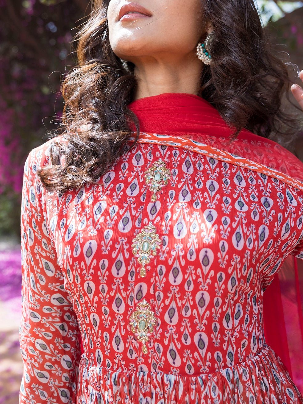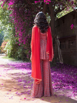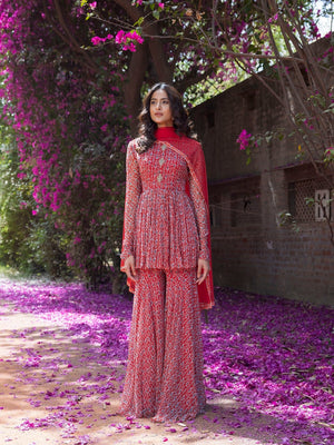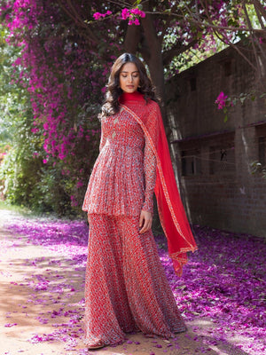 Beautiful red drop print sharara suit with embellished front. Shop online from Pure Elegance.
