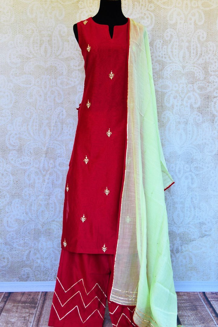 Simple and elegant red palazzo suit with embroidered buta is perfect for minimal festive look or family get together. It is decorated with chevron embroidery on the palazzo which highlight it perfectly. It comes with a dupatta. Buy online from Pure Elegance or visit our store in USA!