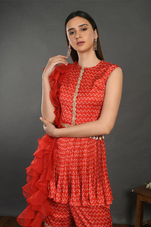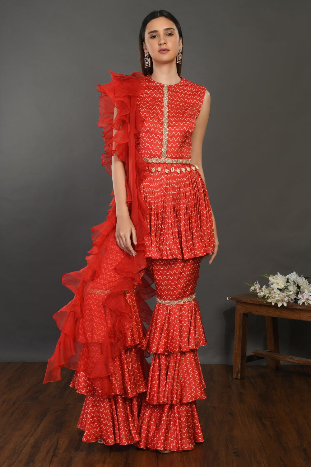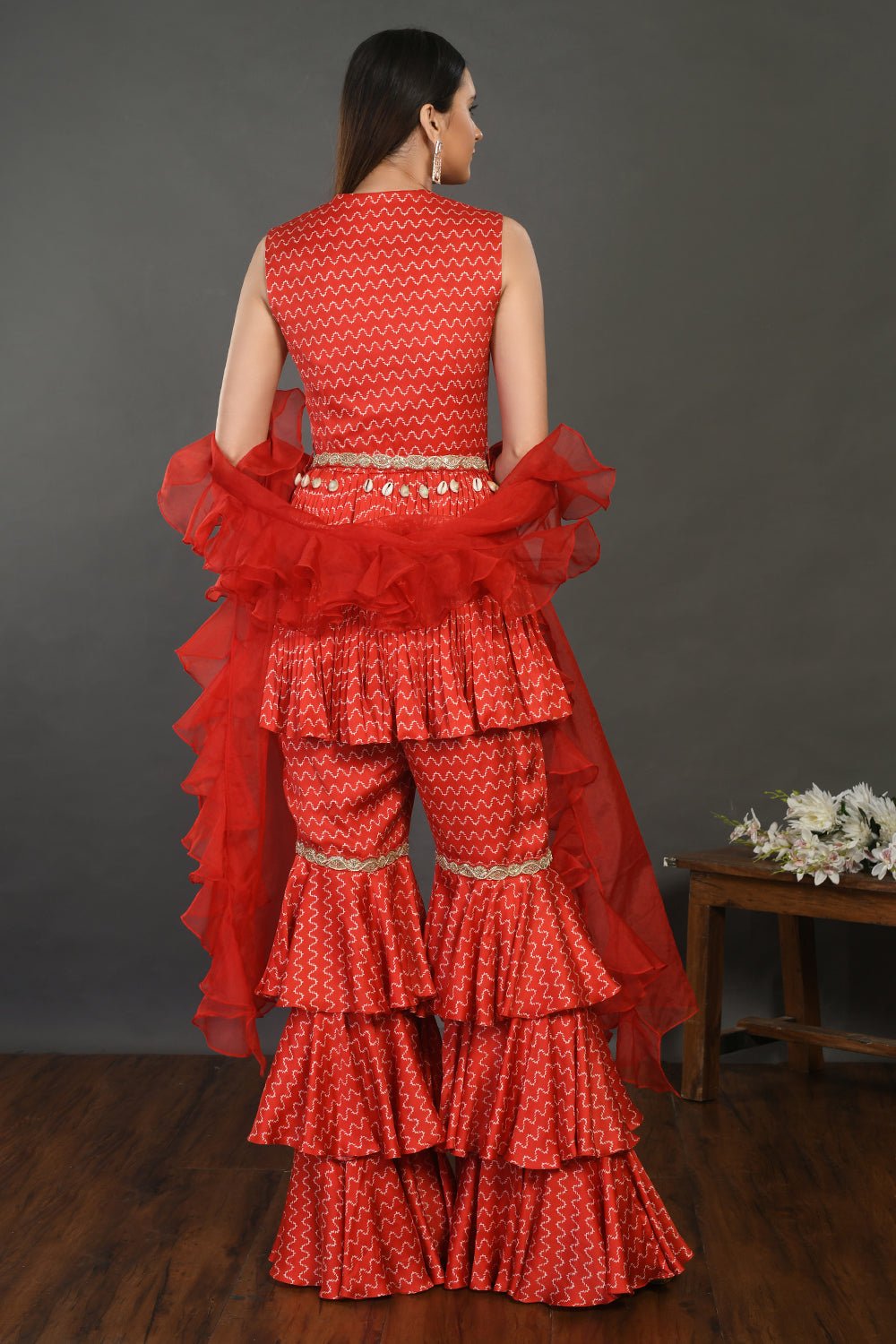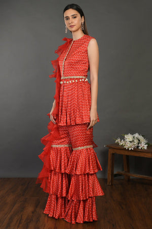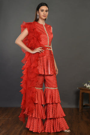 Add a modern vibe to your guest wedding style in this stylish red printed satin tiered gharara suit with organza dupatta. Shop designer suits in USA from Pure Elegance.