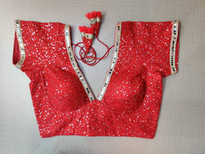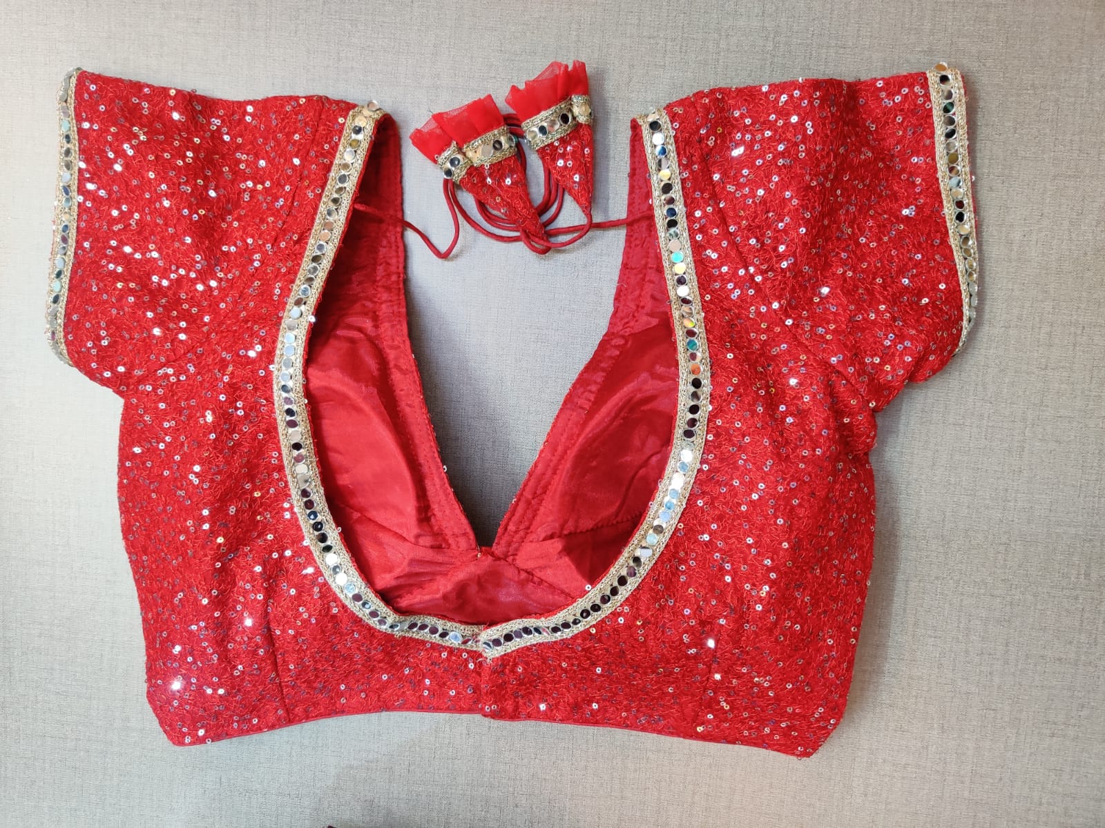 Beautiful red sequin sari blouse with mirror work lace. Buy designer blouse in USA from Pure Elegance.