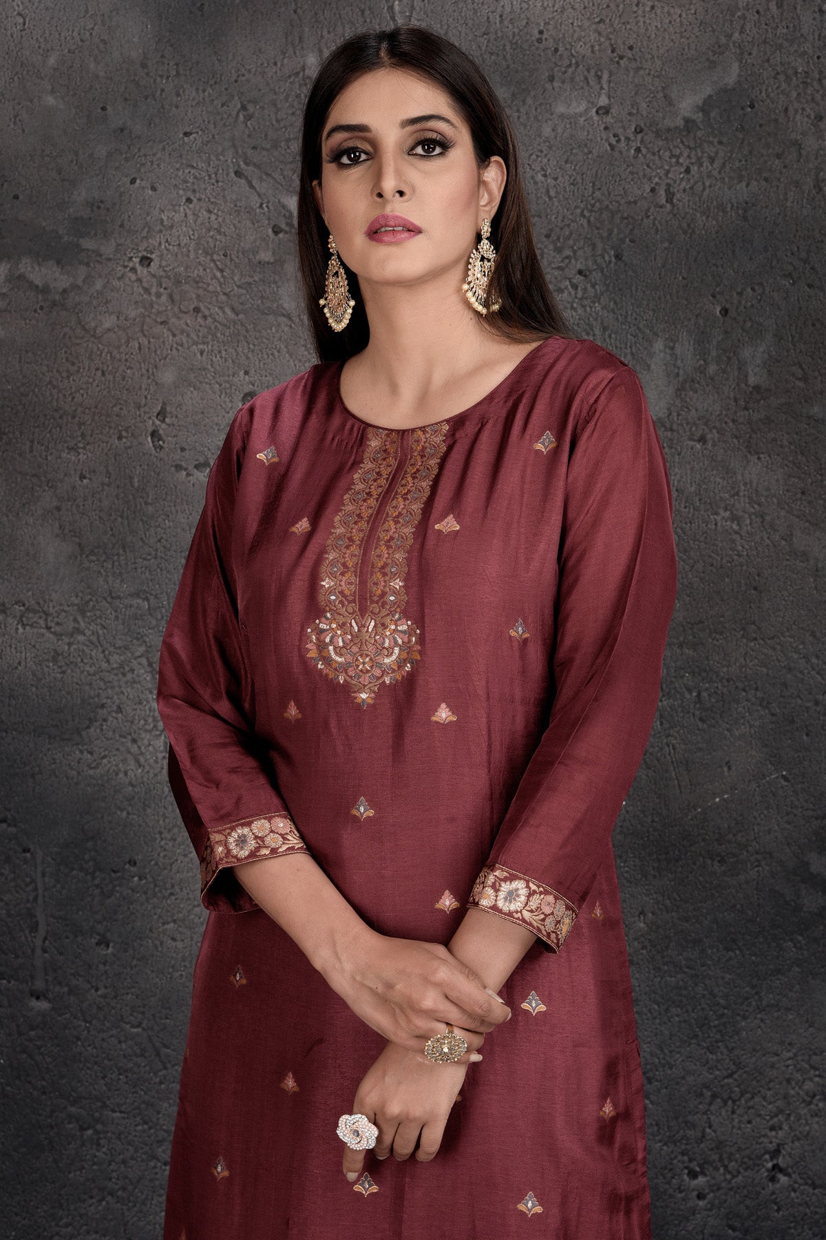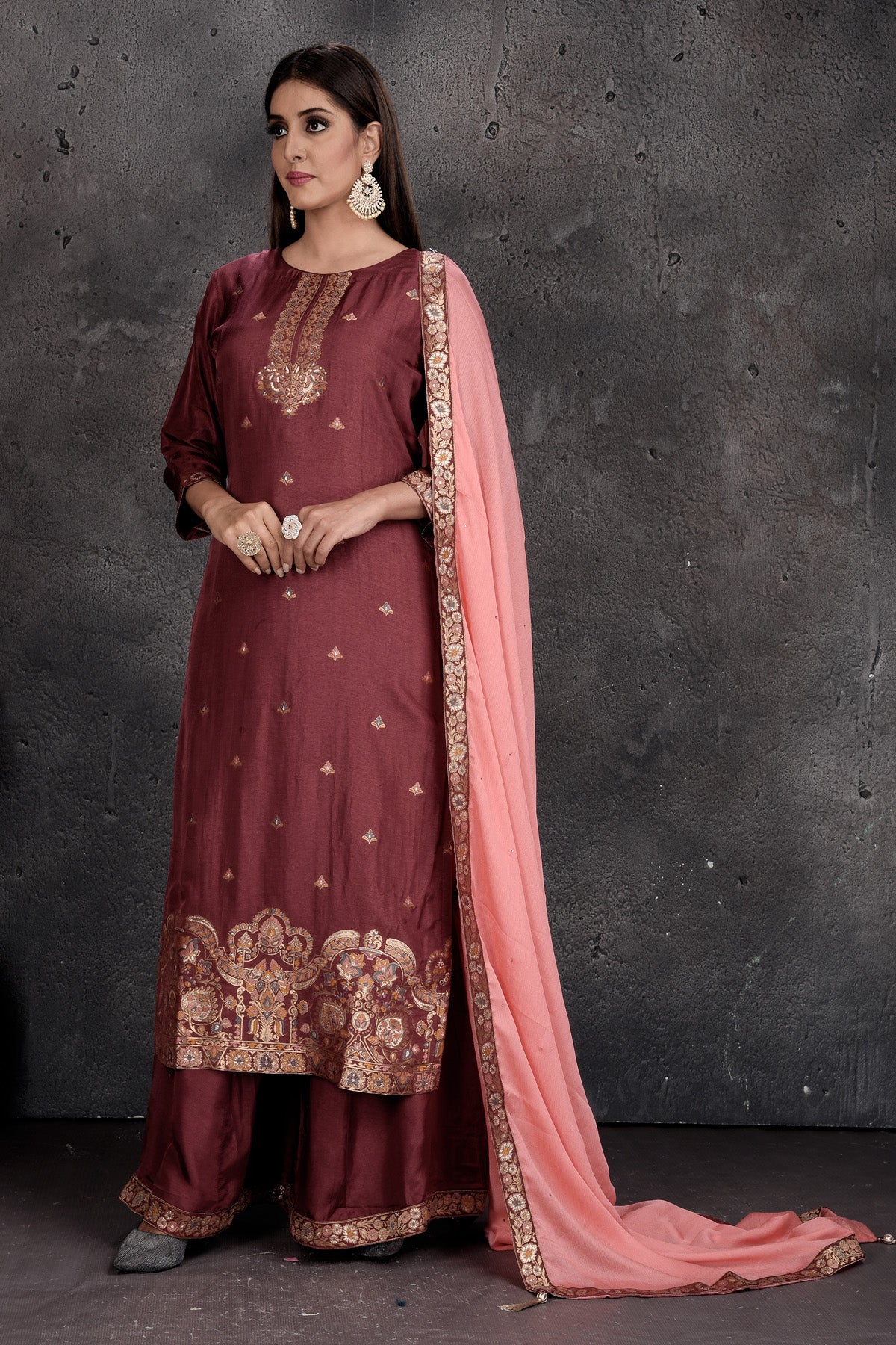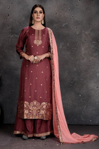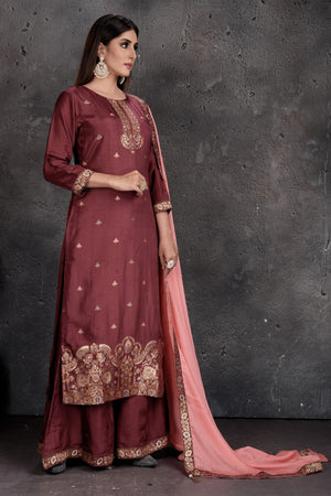 Be a vision of style and elegance at wedding festivities in this stunning rose pink designer palazzo suit with light pink dupatta. Shop Indian dresses in USA from Pure Elegance.