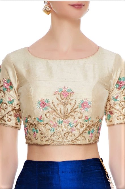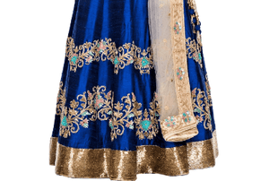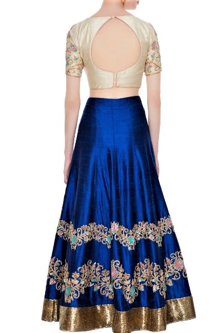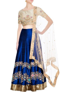 Mesmerize everyone with your wedding style in this royal blue raw silk bridal lehenga! It is finely woven in shimmering sequin & thread french knot embroidery. The cancan under layer creates a dramatic flare. The set comes with an embroidered beige blouse & nude peach net dupatta. (Extra under cancan skirt given). Shop online at Pure Elegance or visit our store in USA.