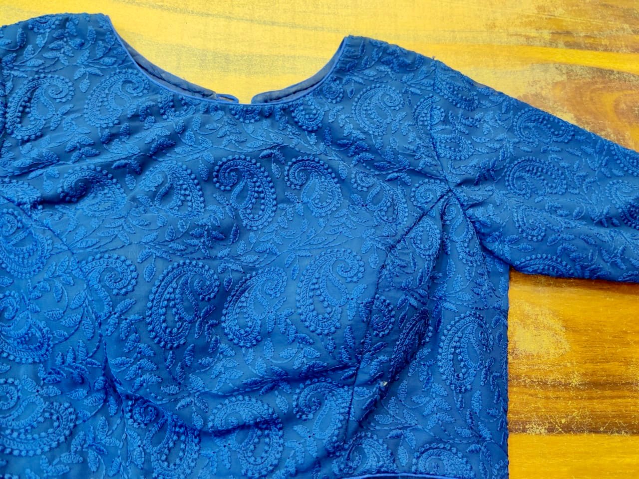 Stunning royal blue Lucknowi embroidery sari blouse. Buy online from Pure Elegance