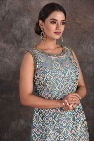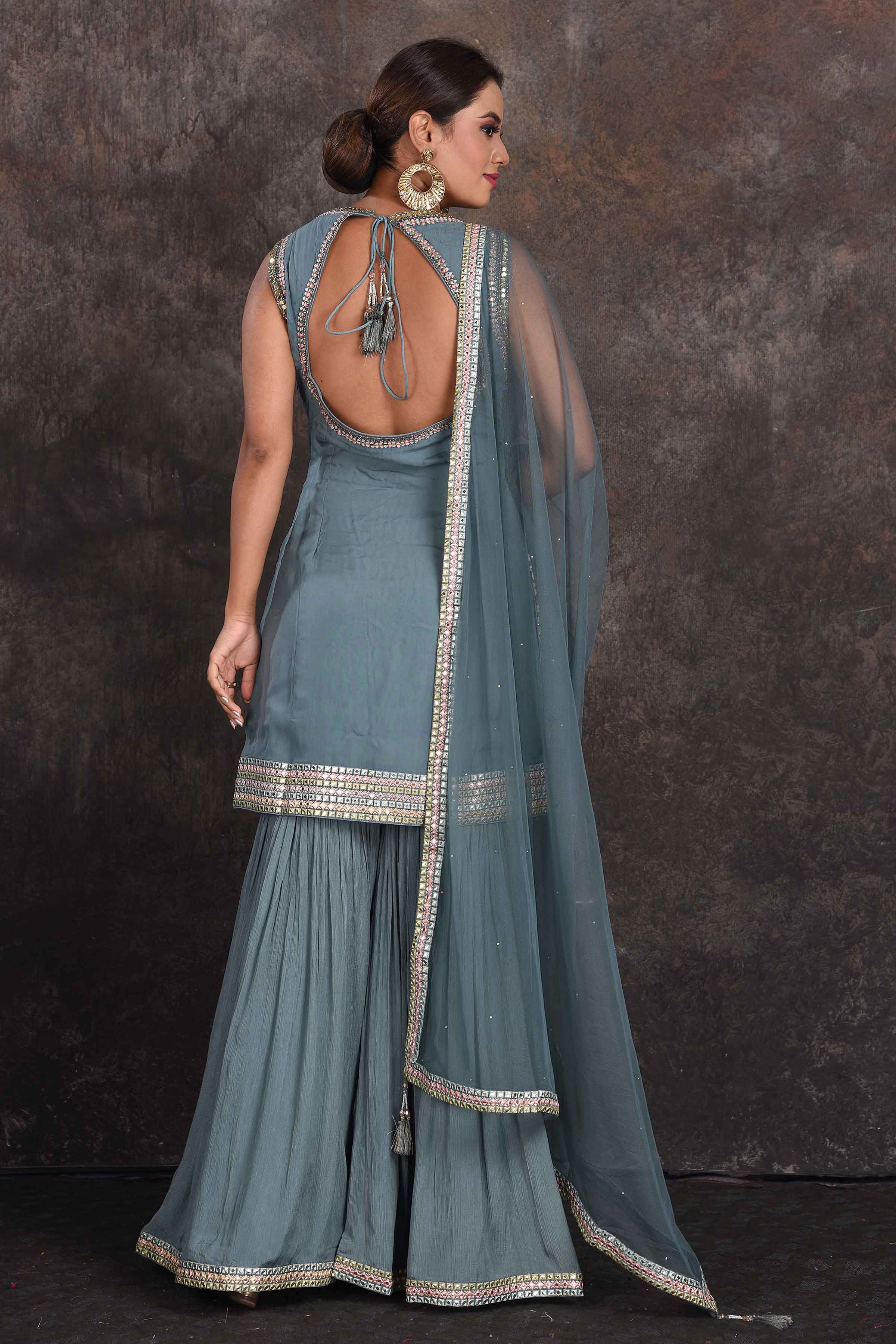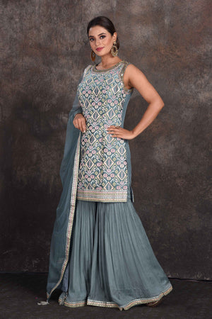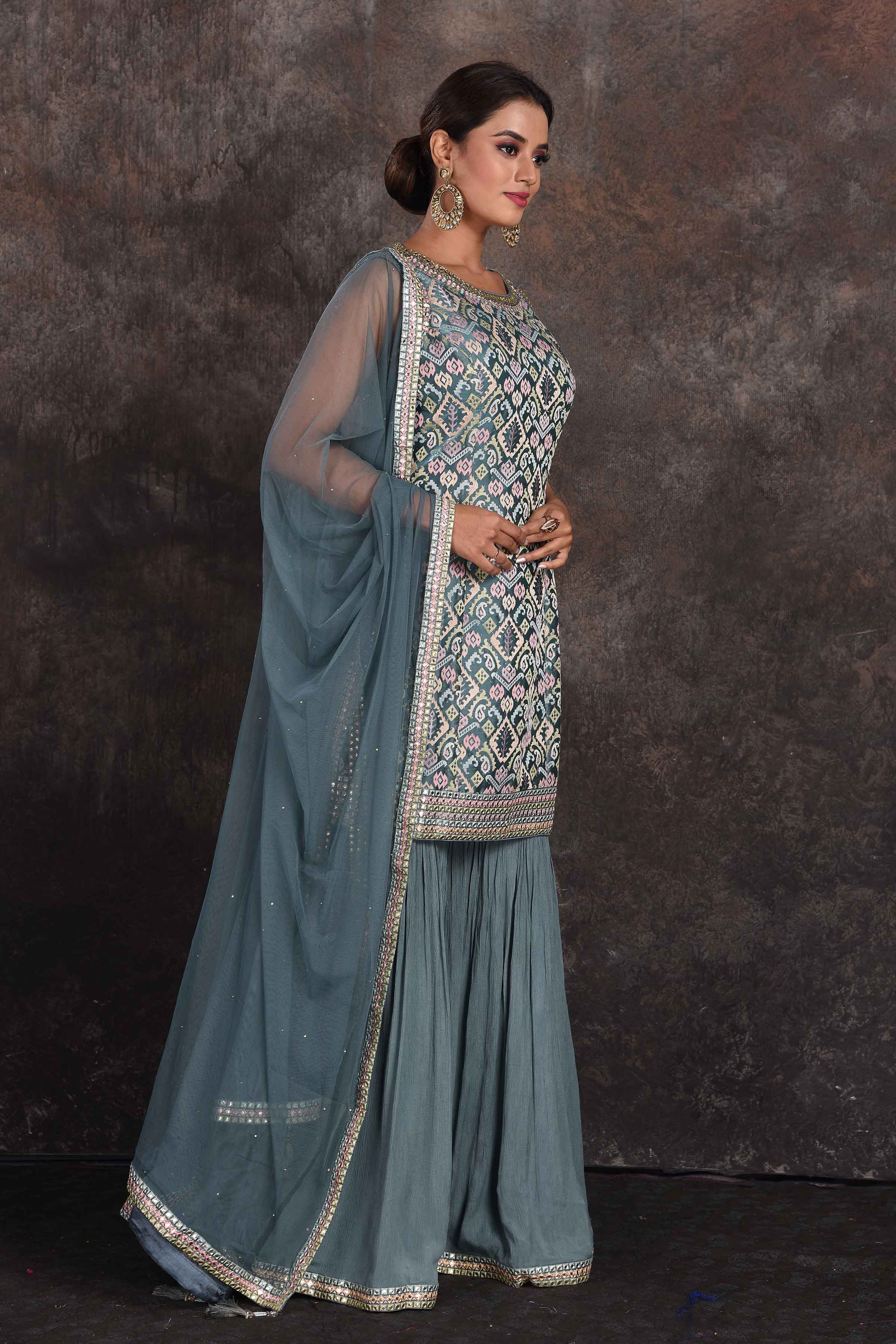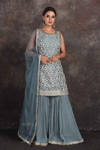 Be the star of the occasion in this beautiful sage green embellished designer sharara suit. The suit comes with a matching dupatta. Shop designer suit in USA from Pure Elegance.