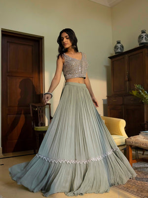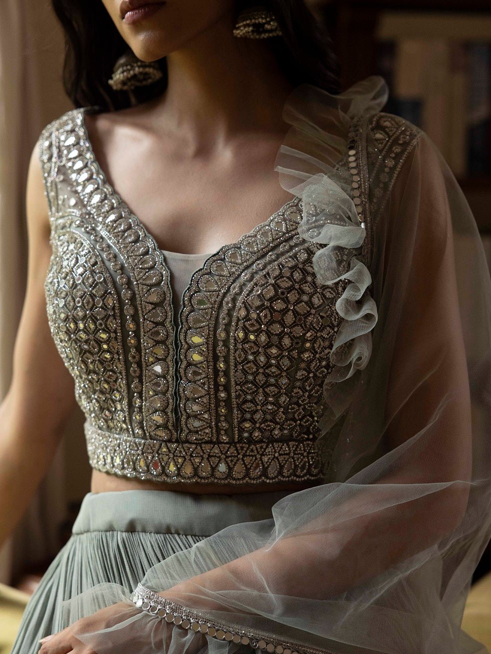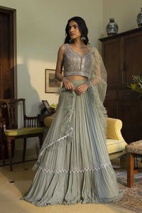 Beautiful slate grey net lehenga. The lehenga is enhanced with applique mirror work blouse and is perfect for mehendi and sangeet. It comes with a matching dupatta. Shop online from Pure Elegance.