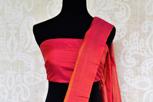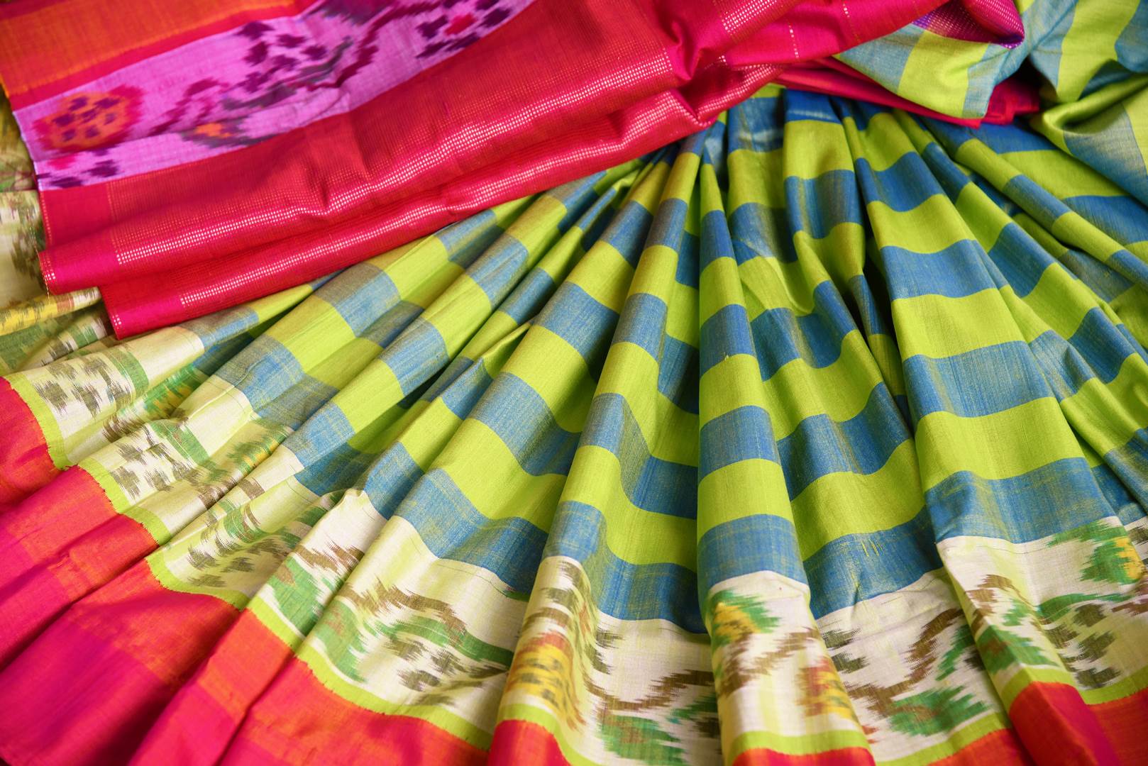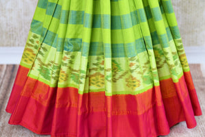 Beautiful green striped eri silk saree with a contrasting pink ikkat border and pallu is a stunning choice for party and special occasions. It comes with a pink blouse piece. Shop online at Pure Elegance or visit our store in USA