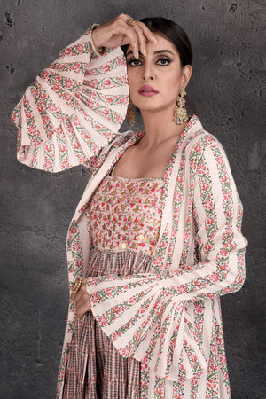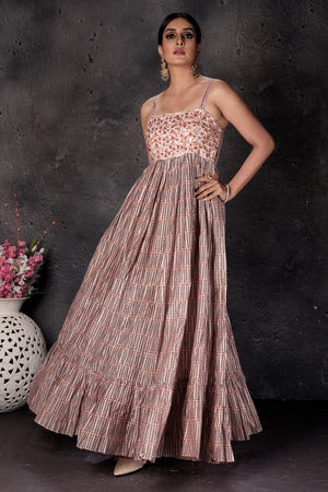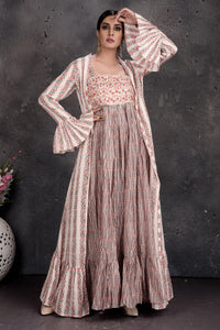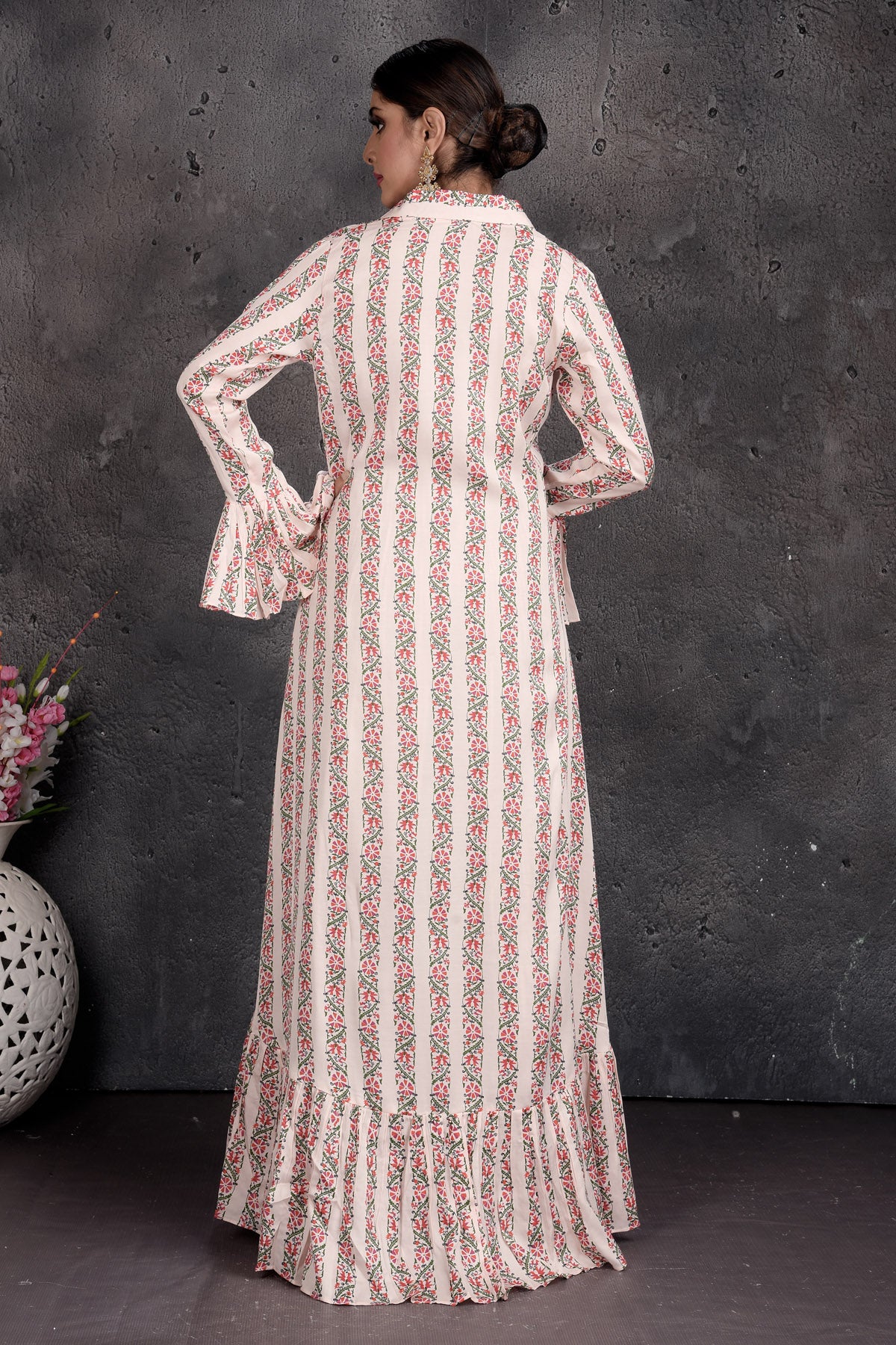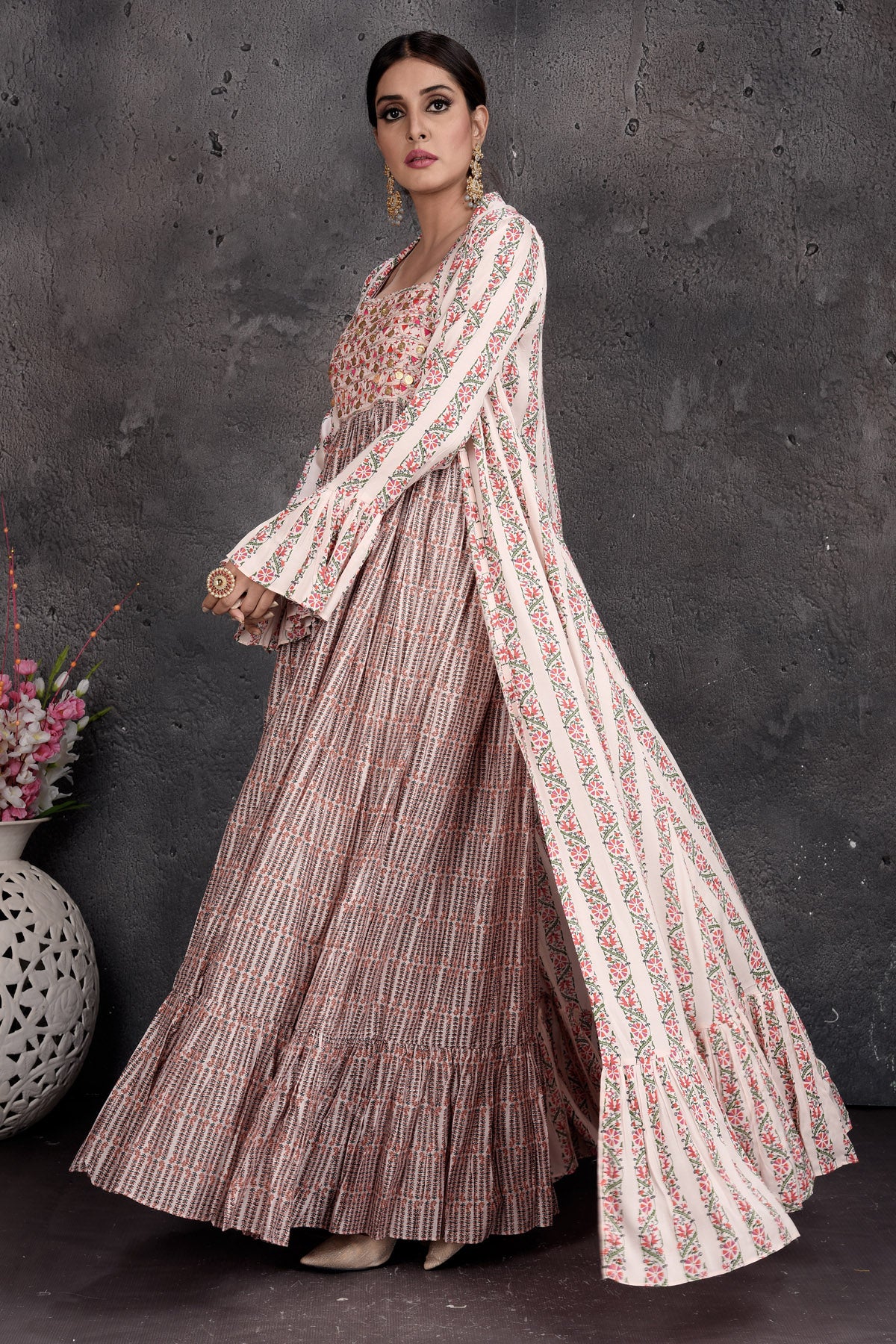 Be a vision of style and elegance in this beige printed maxi dress with shrug. Shop Indian dresses in USA from Pure Elegance.